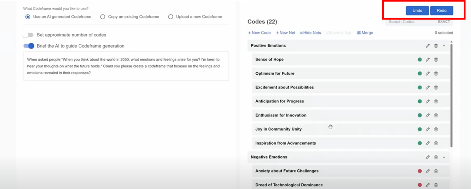 You can still modify the the generated codeframes before proceeding with the actual coding. You can add new codes, add new nets, merge codes on the codeframe.