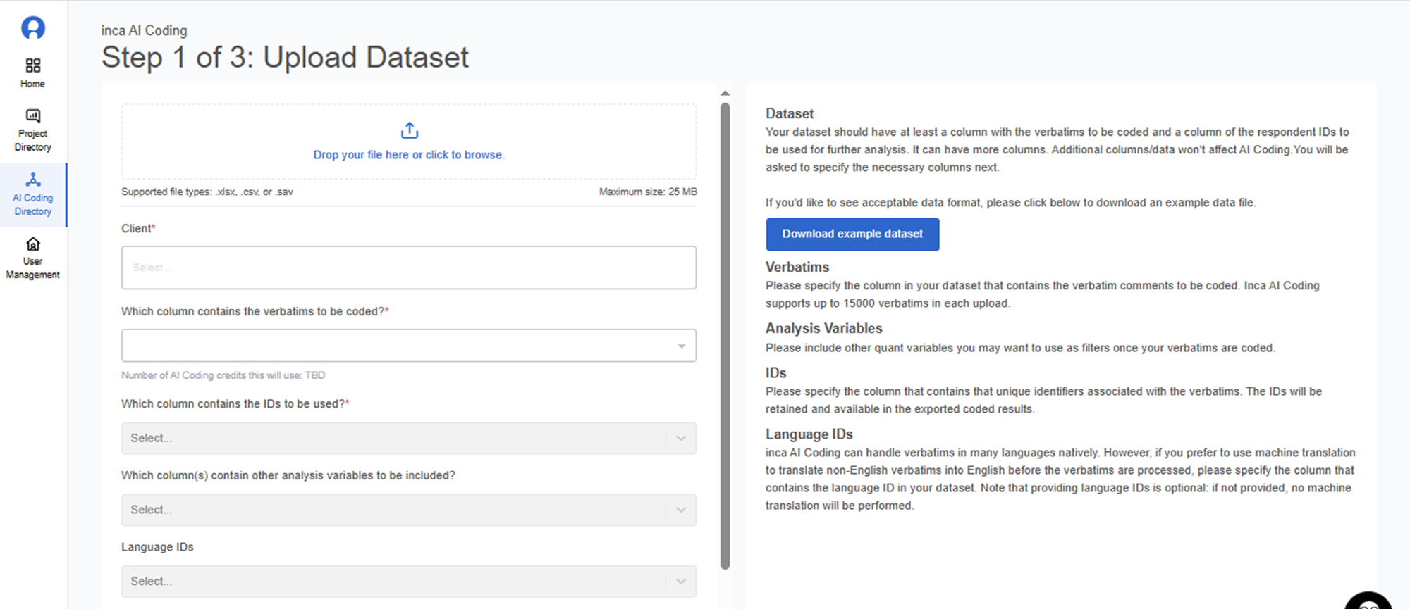 You will be directed to the inca AI Coding studio to Upload Dataset. You can either drop the file or upload the data set.
