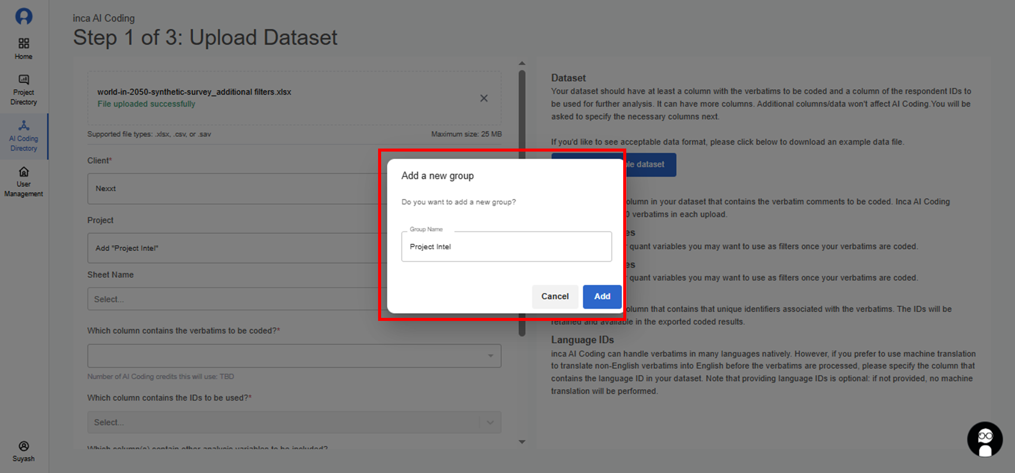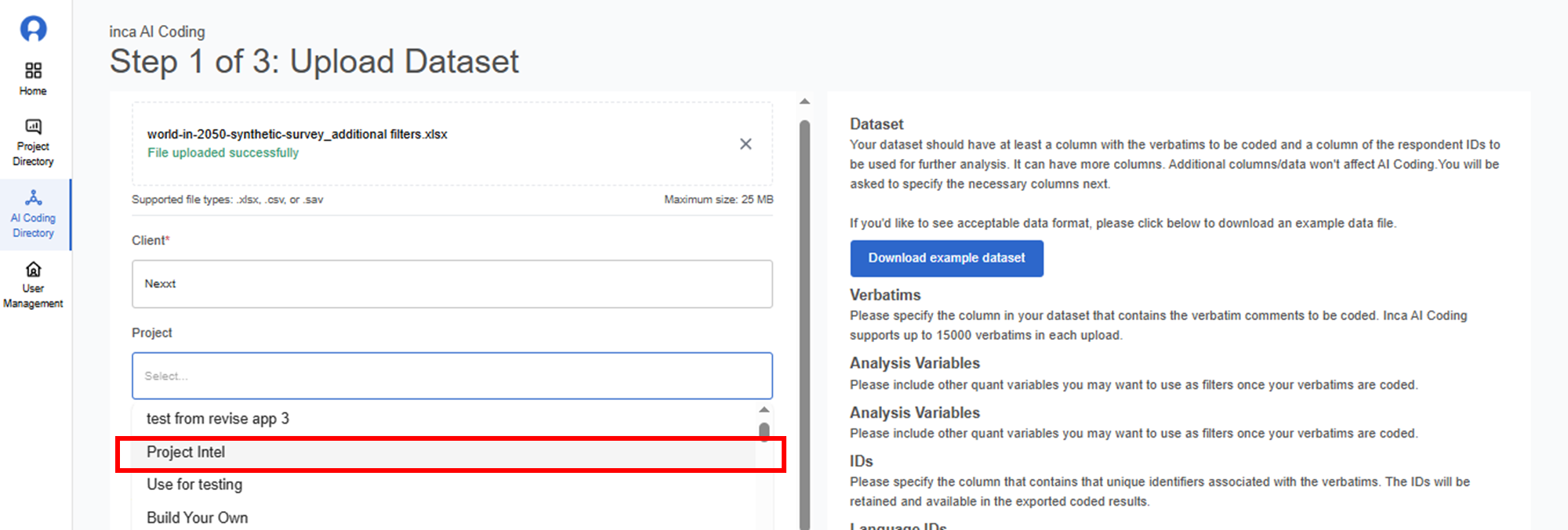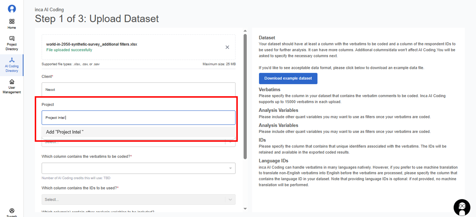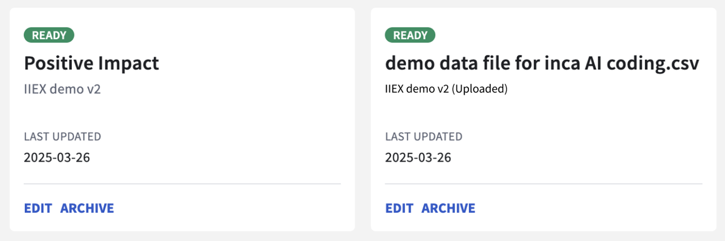 When you have existing inca studies in the dashboard (Project Directory), and you've done AI coding to the open end questions on the dashboard, you can also view these AI Coding instances in the AI Coding Directory page. Instead of assigning a project, the project name (from the dashboard Project Directory) will be shown automatically to AI coding instance card.