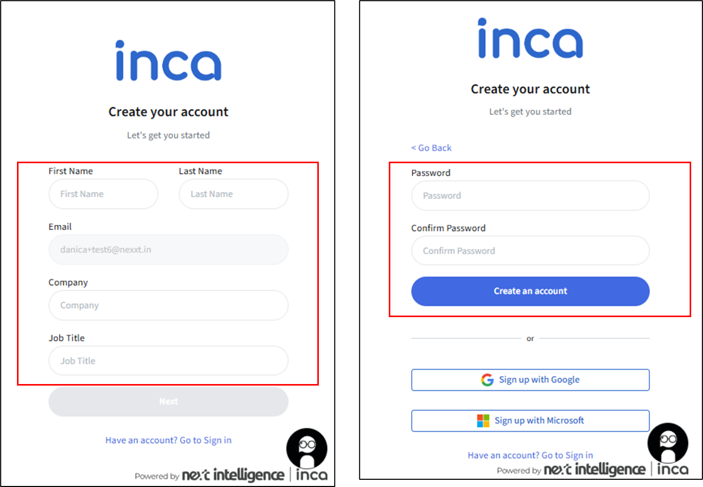 - User will receive an email from inca to activate the account and this will take you the standard sign in page. User can input their Name, Company, (job title - optional) and Password. The email and password will be saved and click Sign In.