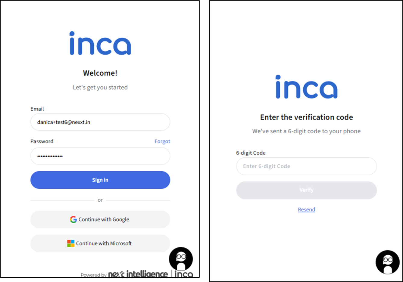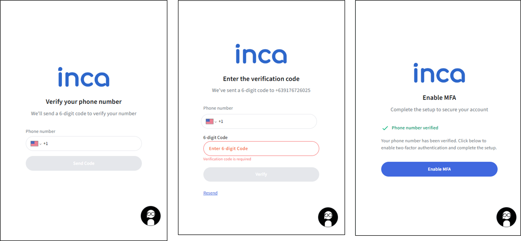 For existing inca platform users who want to enable their MFA in their account, please inform your inca Customer Success Manager or the support team (support@nexxt.in). - Once your account has been approved for MFA login, users will be taken to the Phone Verification page as per Step 2 above and complete the MFA setup.
