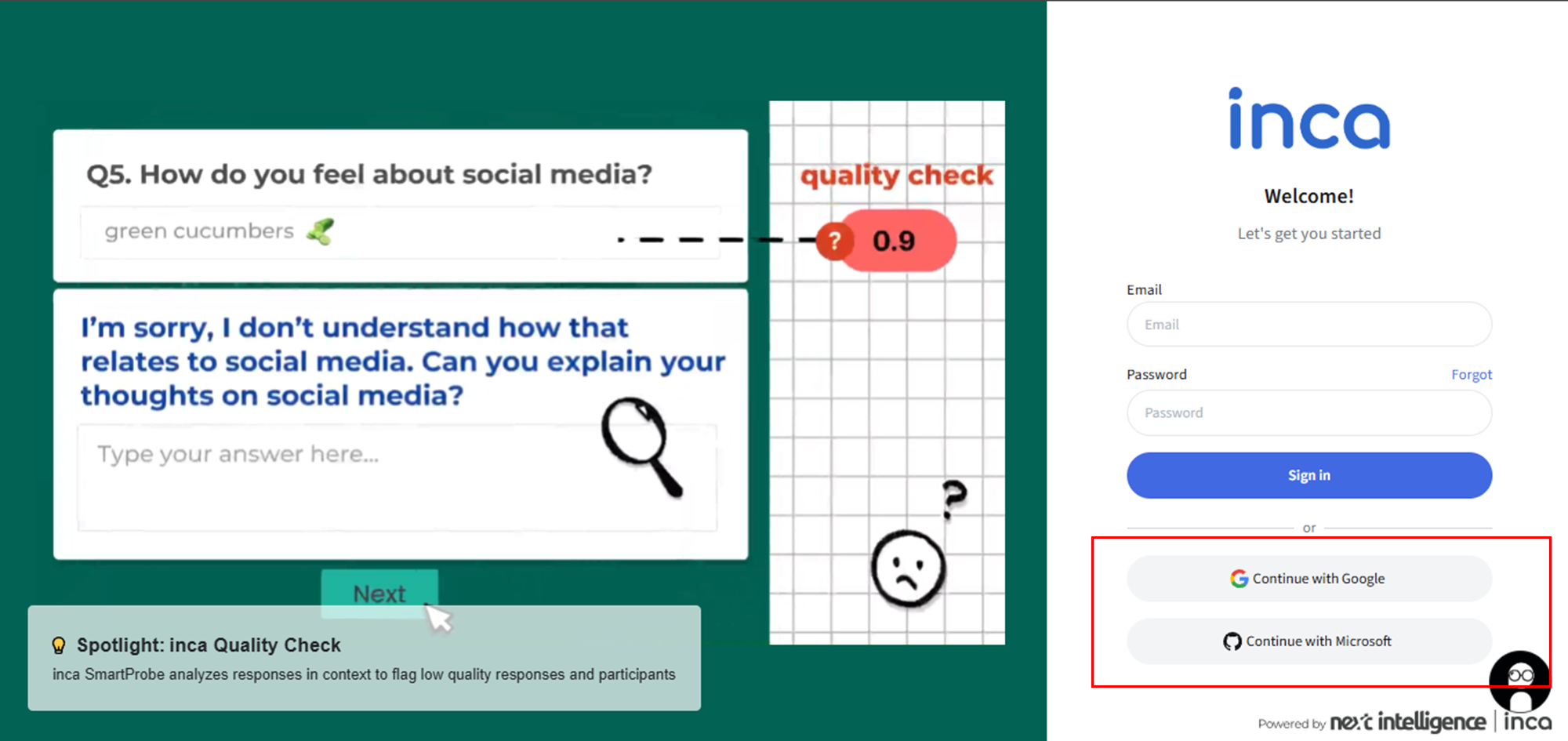 Single sign-on (SSO) is an authentication solution that allows users to log in to multiple applications and websites with one-time user authentication. In this case, users will be allowed to log in to the inca platform using their Google and Microsoft accounts.