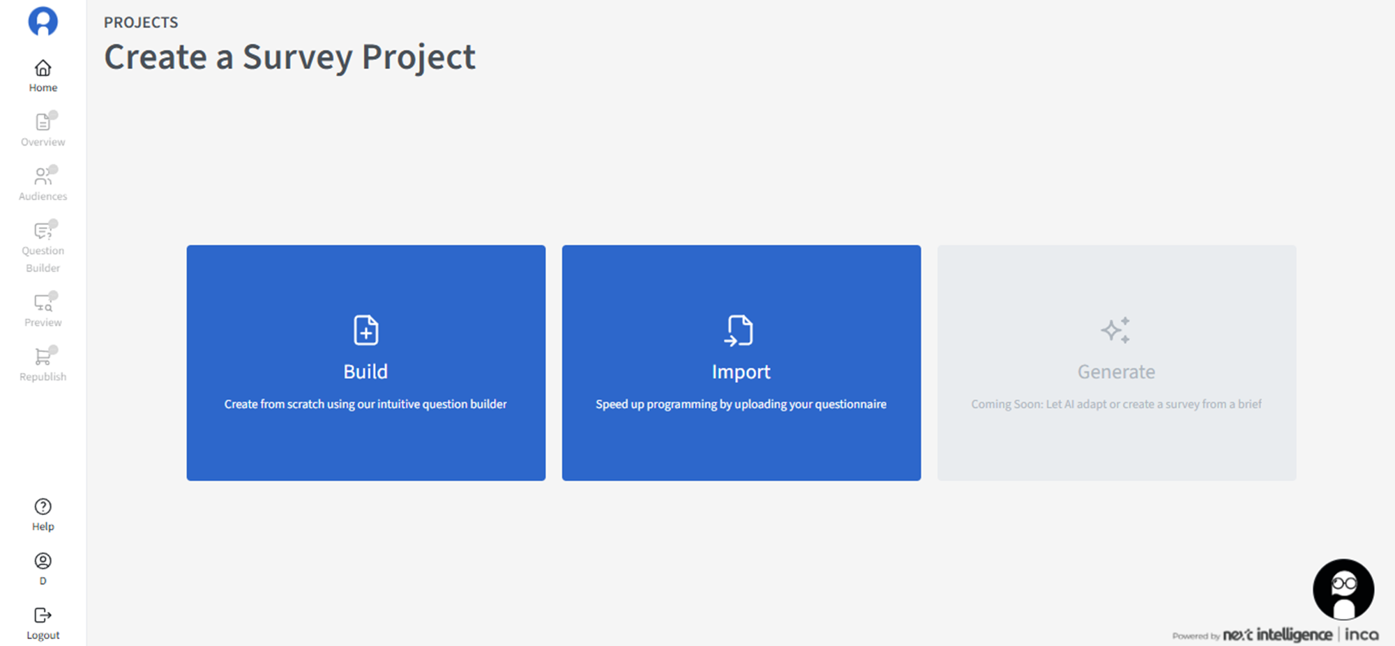 Once you've signed up and logged in to your account, you will be directed to the PROJECT DIRECTORY page. To create a new study, just click the +New Project button. Users can either build a study from scratch or upload from an existing questionnaire files (Word or Excel).