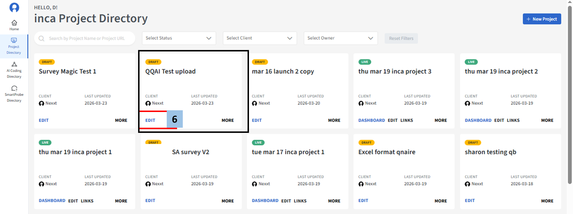 - The Project Card becomes clickable. Simply click Edit to edit and review the imported questionnaire