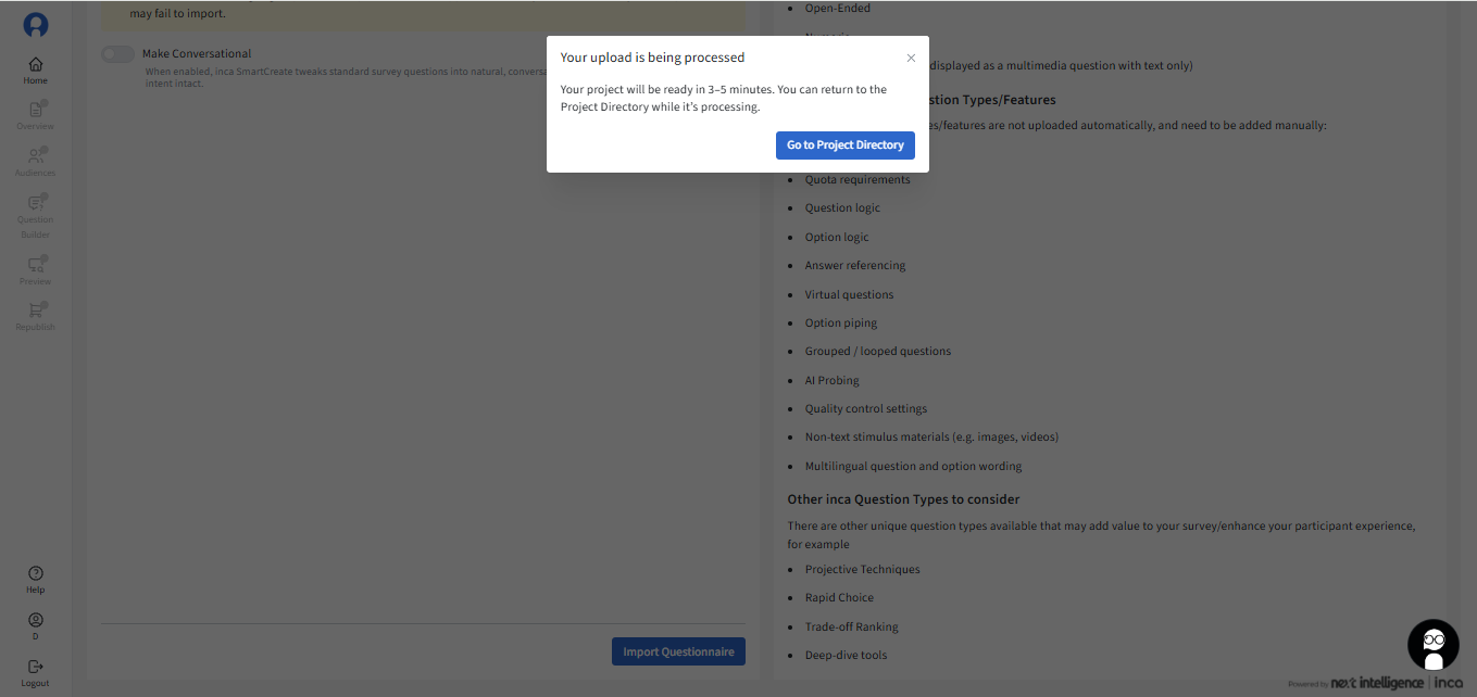 4. Upon submission, a popup is displayed informing the user that the import will take a few minutes minutes to process and users can go back to the Project Directory.