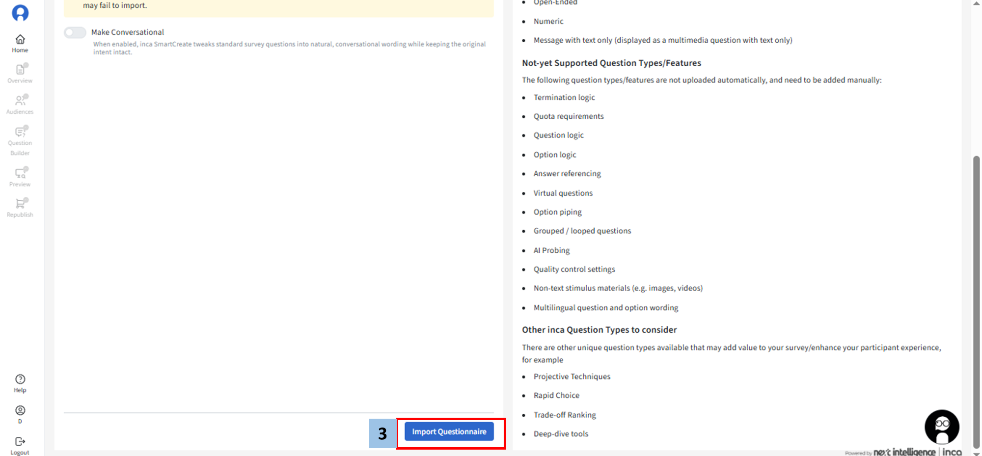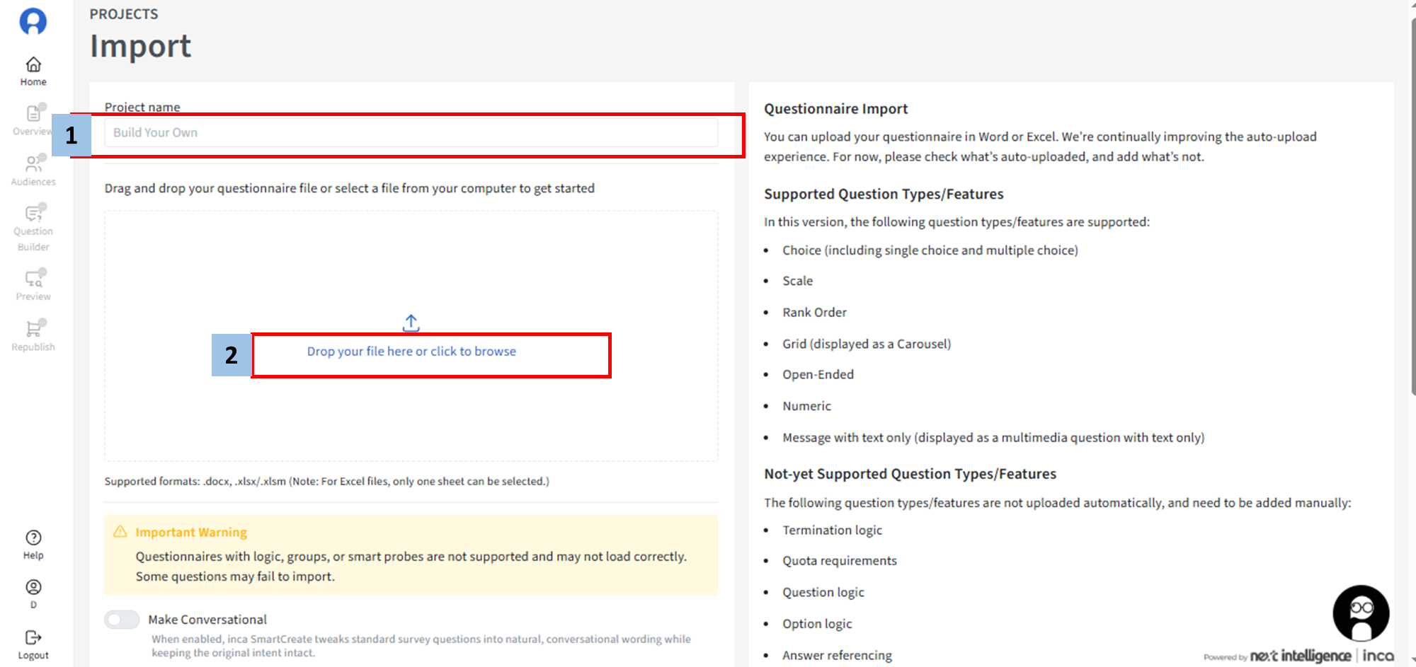 In the Import Page, follow these steps to upload the questionnaire: