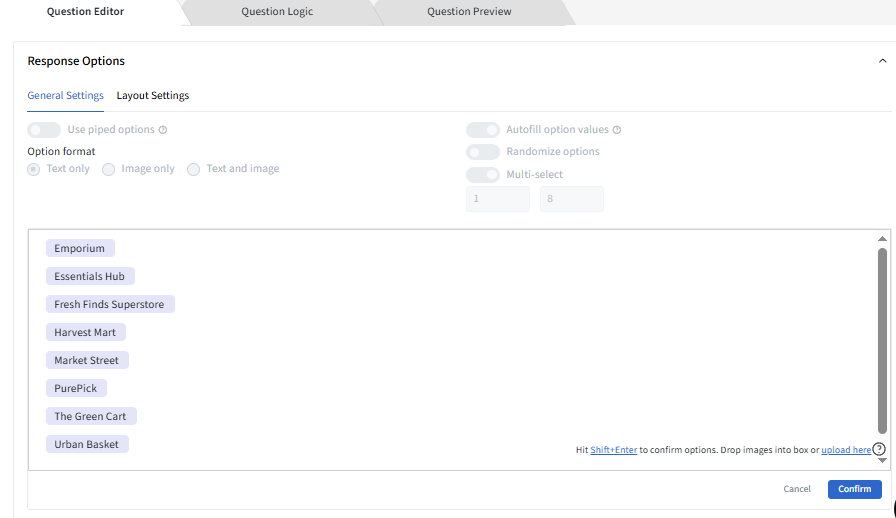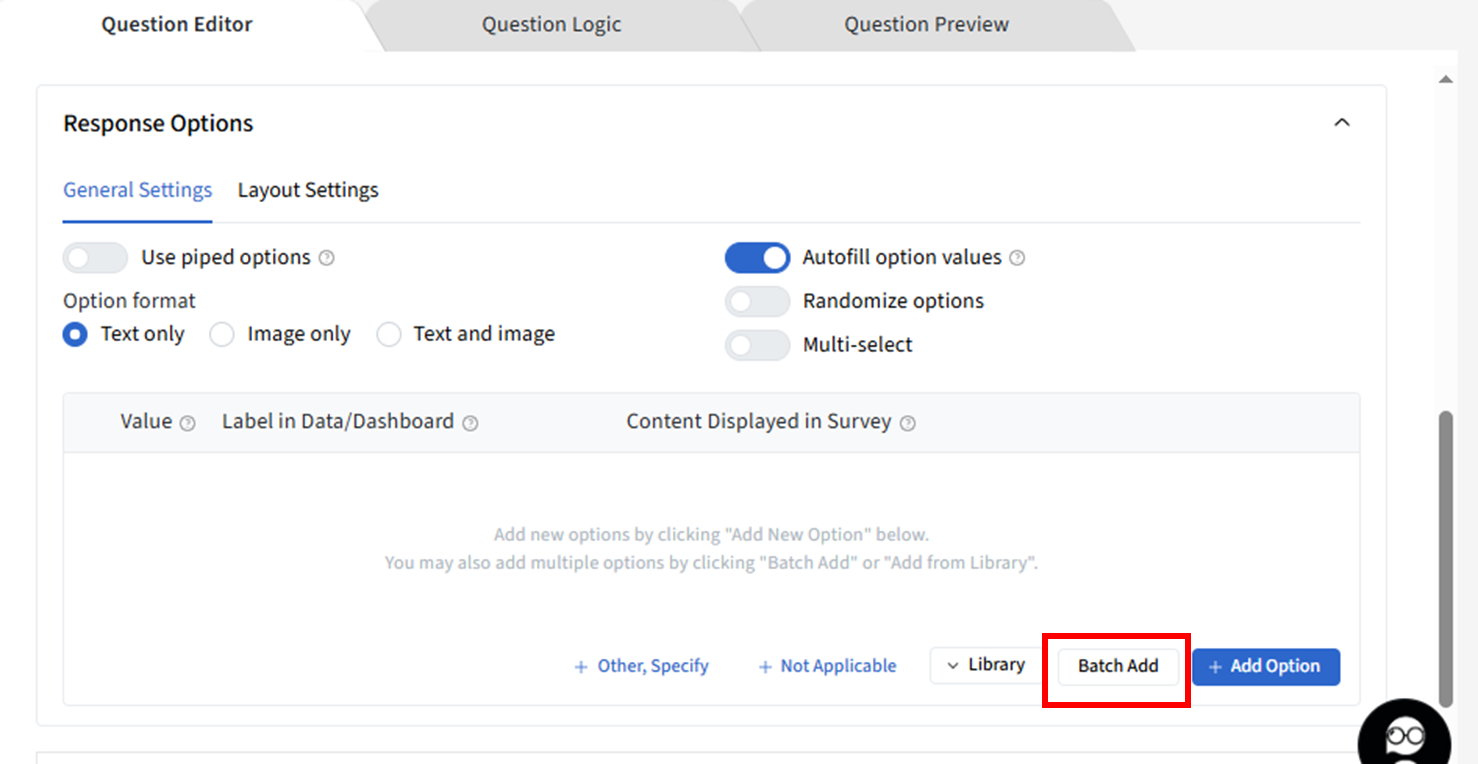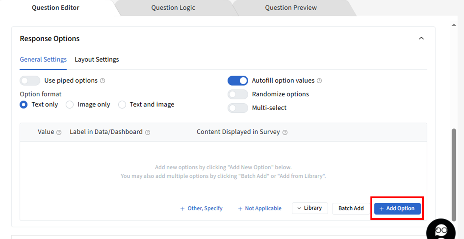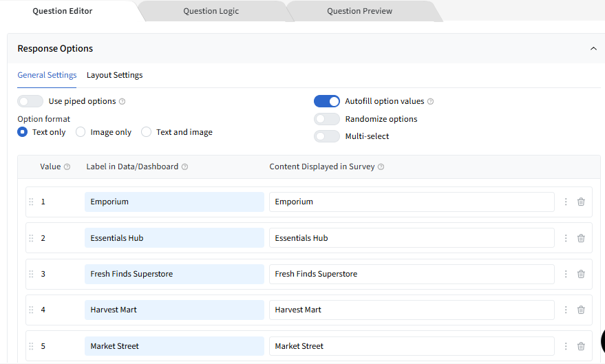 The user can also bulk upload images for the image options, and the names of these image files will automatically become the default option text and labels. However, the user retains the ability to alter the option text and label later if needed.