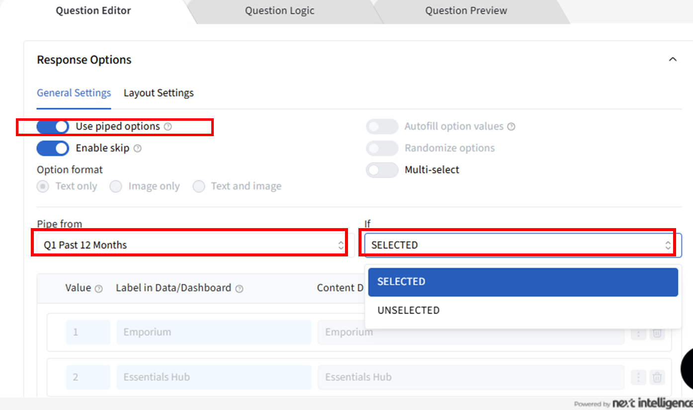 The user can insert, or "pipe," an answer from a previous question into a question at a later stage in the survey. You may choose to “pipe” a TEXT format answer or an IMAGE format answer, and you may also choose to “pipe” from SELECTED answers or UNSELECTED answers from a previous question.