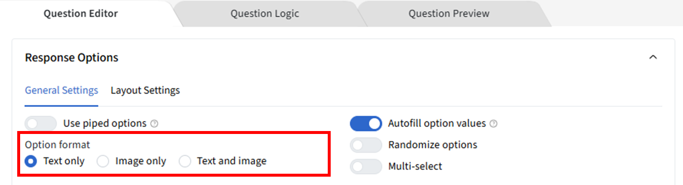 The users can specify the option formats and choose from text, image and both. This setting is applicable to