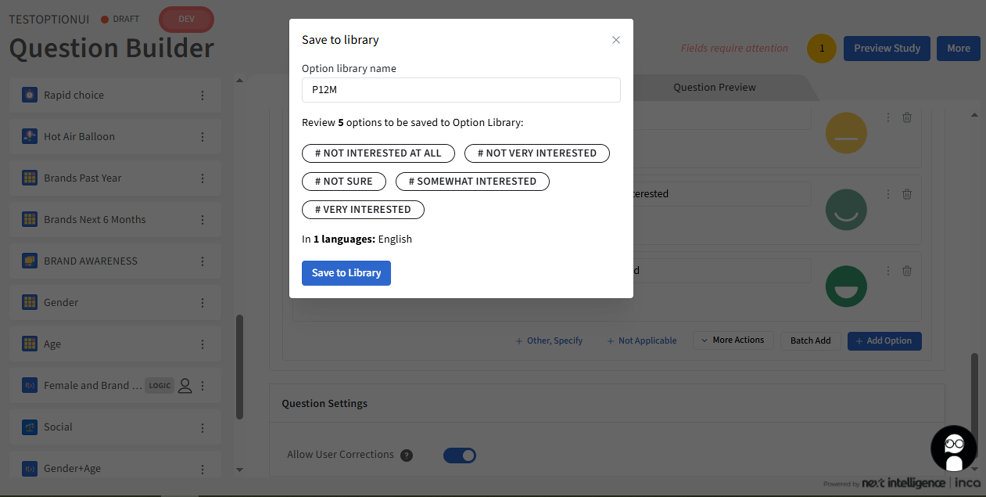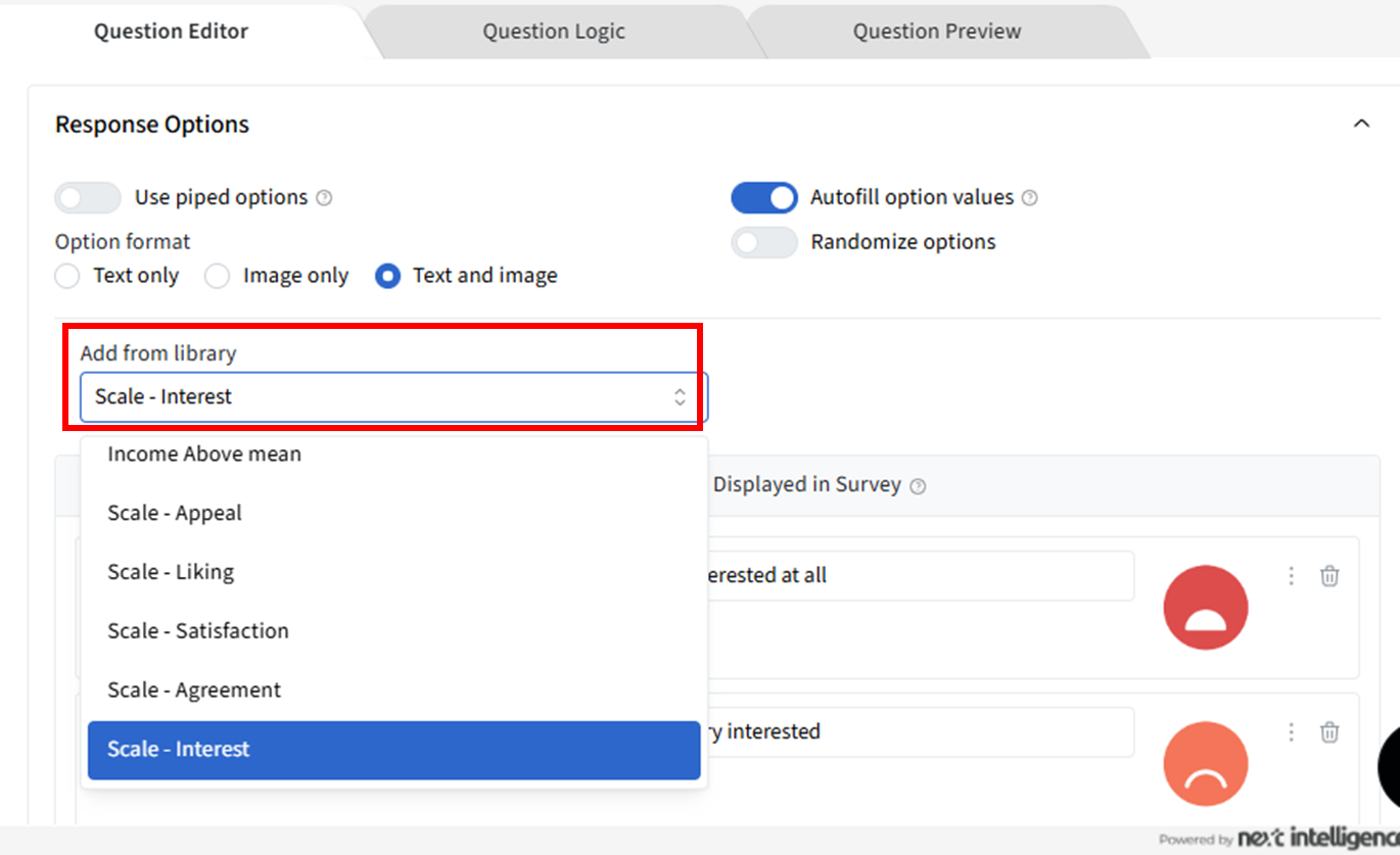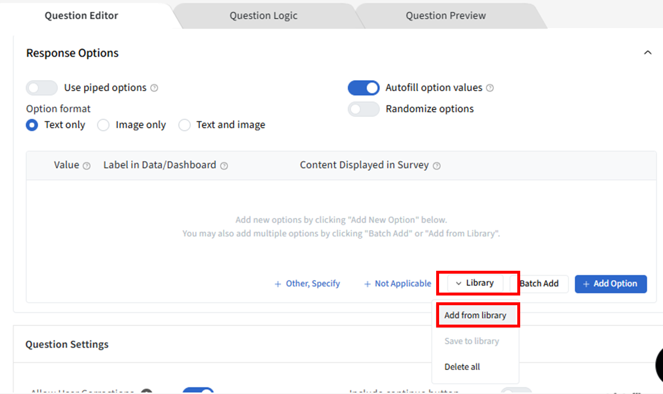 The user can add options using the pre-determined list in the Library by clicking Library > Add from Library
