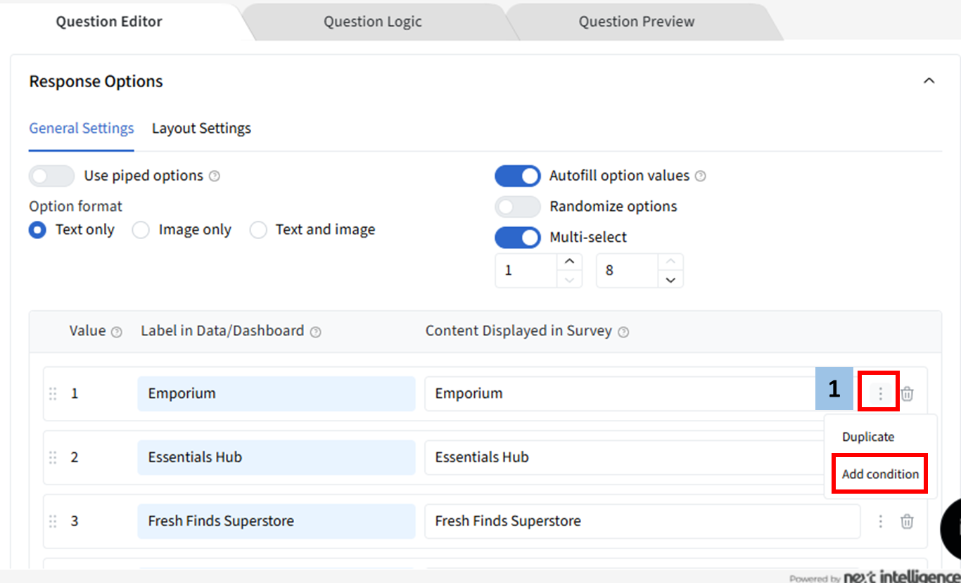 1. In the Response Options Box, select the option you want to apply condition by clicking the vertical ellipsis icon > Add condition