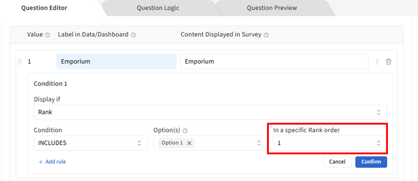 Please note in Rank Order Question, user can specify a specific rank order after INCLUDES and does not INCLUDE the options. For example, user can set up a logic where a Rank Order Question INCLUDES Option 1 in the 1st rank. They can also set up a logic where a Rank Order Question INCLUDES Option 1 in ANY rank order.