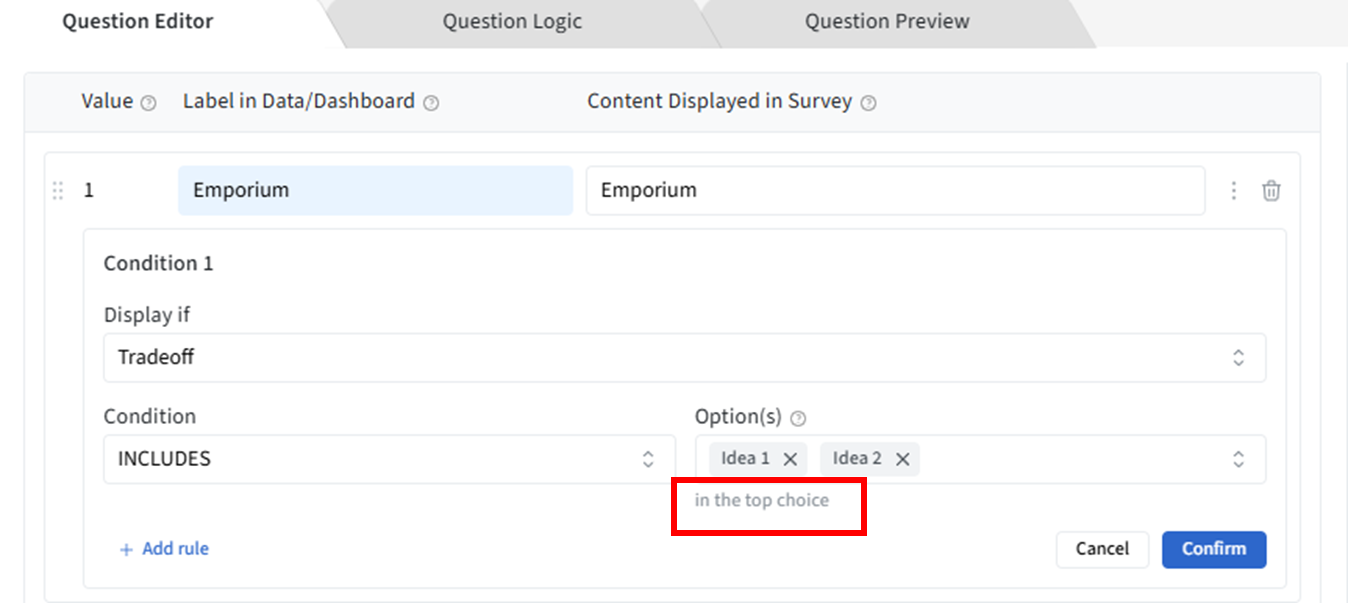 Please note in Tradeoff Ranking Question, INCLUDES and does not INCLUDE applies to the Top Choice only. For example, user can set up a logic where a Tradeoff Ranking Question INCLUDES Idea 1 or Idea 2 in the Top Choice.