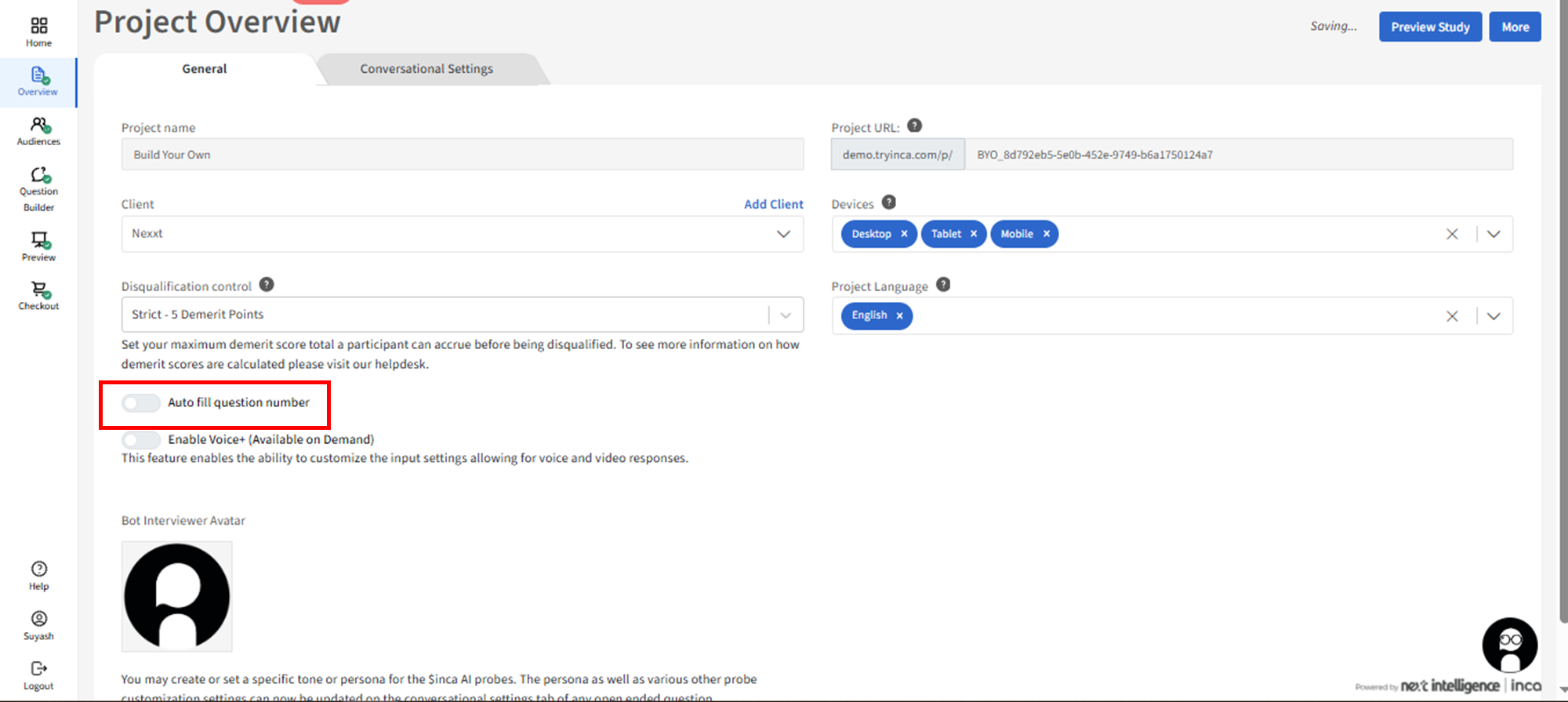 1. In the Overview page, turn off the toggle for "Auto fill question number"