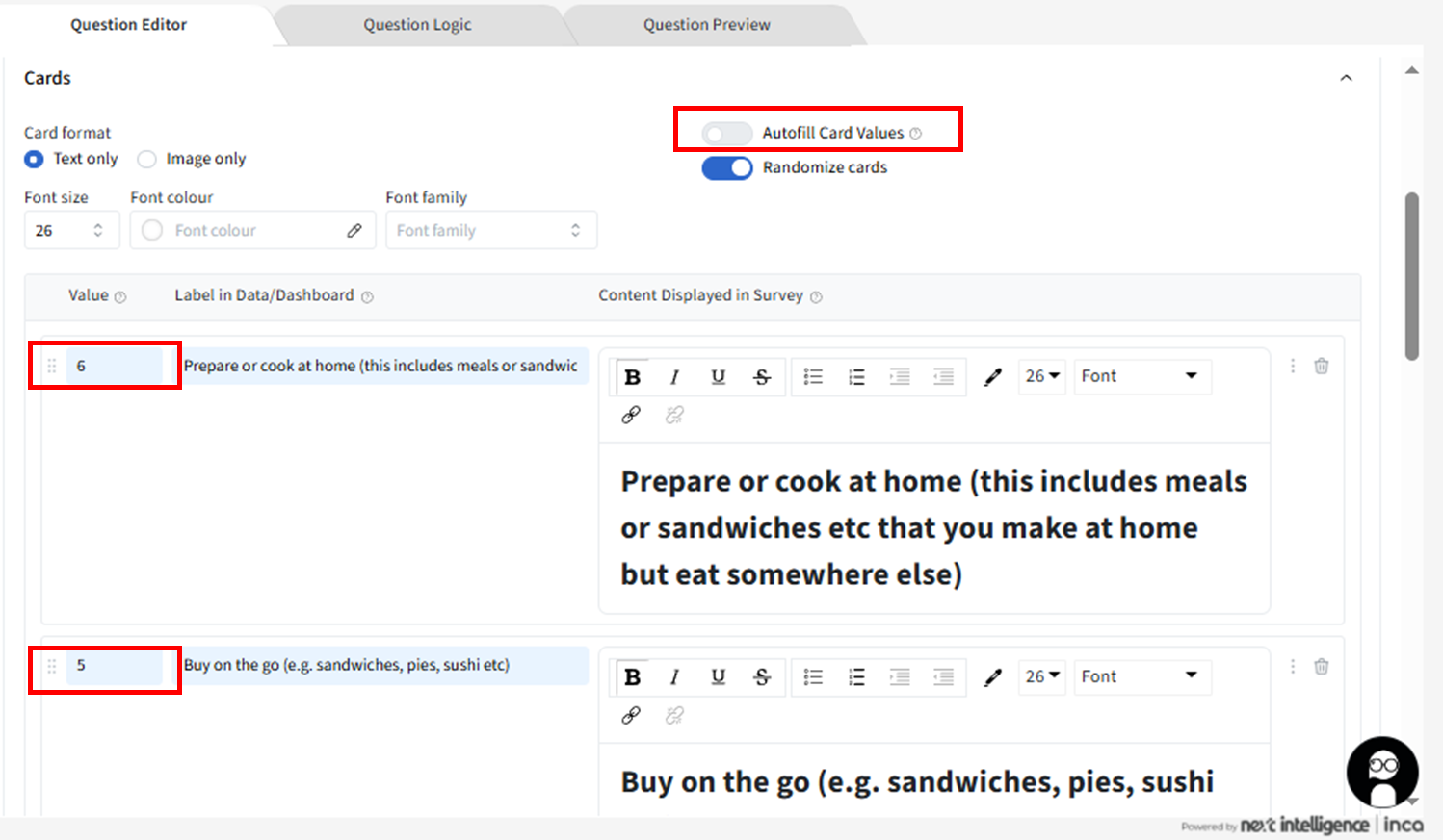 For question types that include both cards and options - such as Carousel and Tradeoff Ranking, users can either use auto-generated values based on card order or manually define their own card numbers. Please note that only numbers can be used to define Card Values in Carousel and Tradeoff Ranking cards, and the use of letters are not allowed.