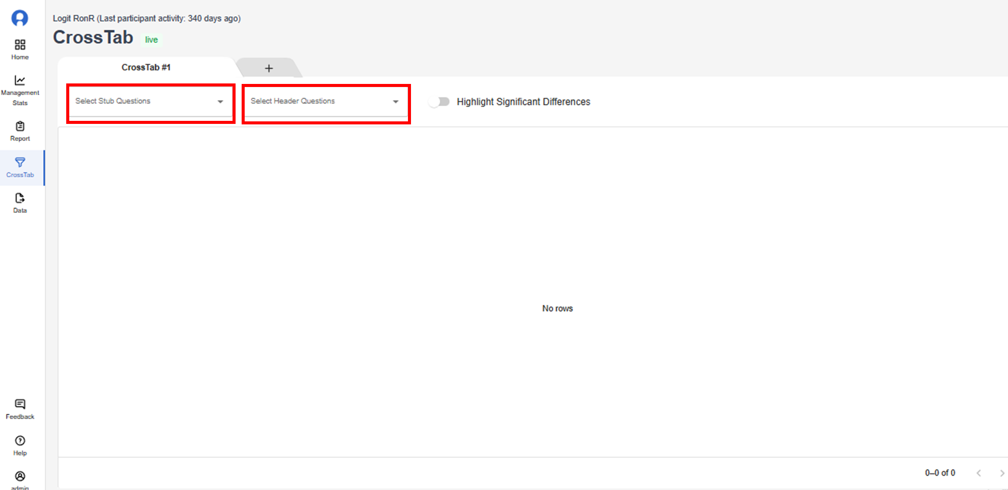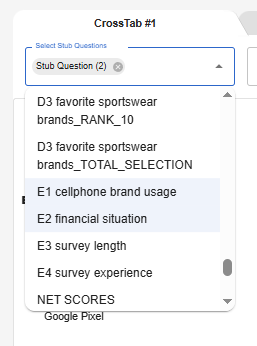 1. In the CrossTab Page, select your Stub Question(s) and Header Question(s) on the drop down list.