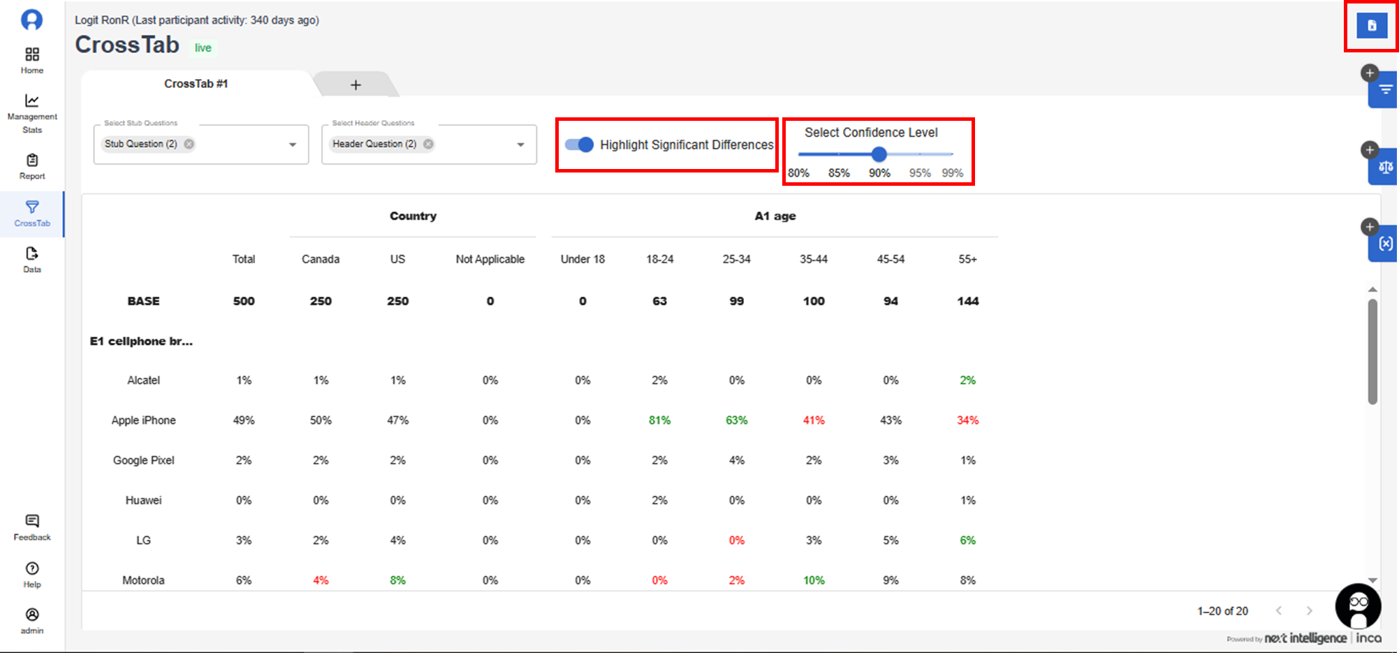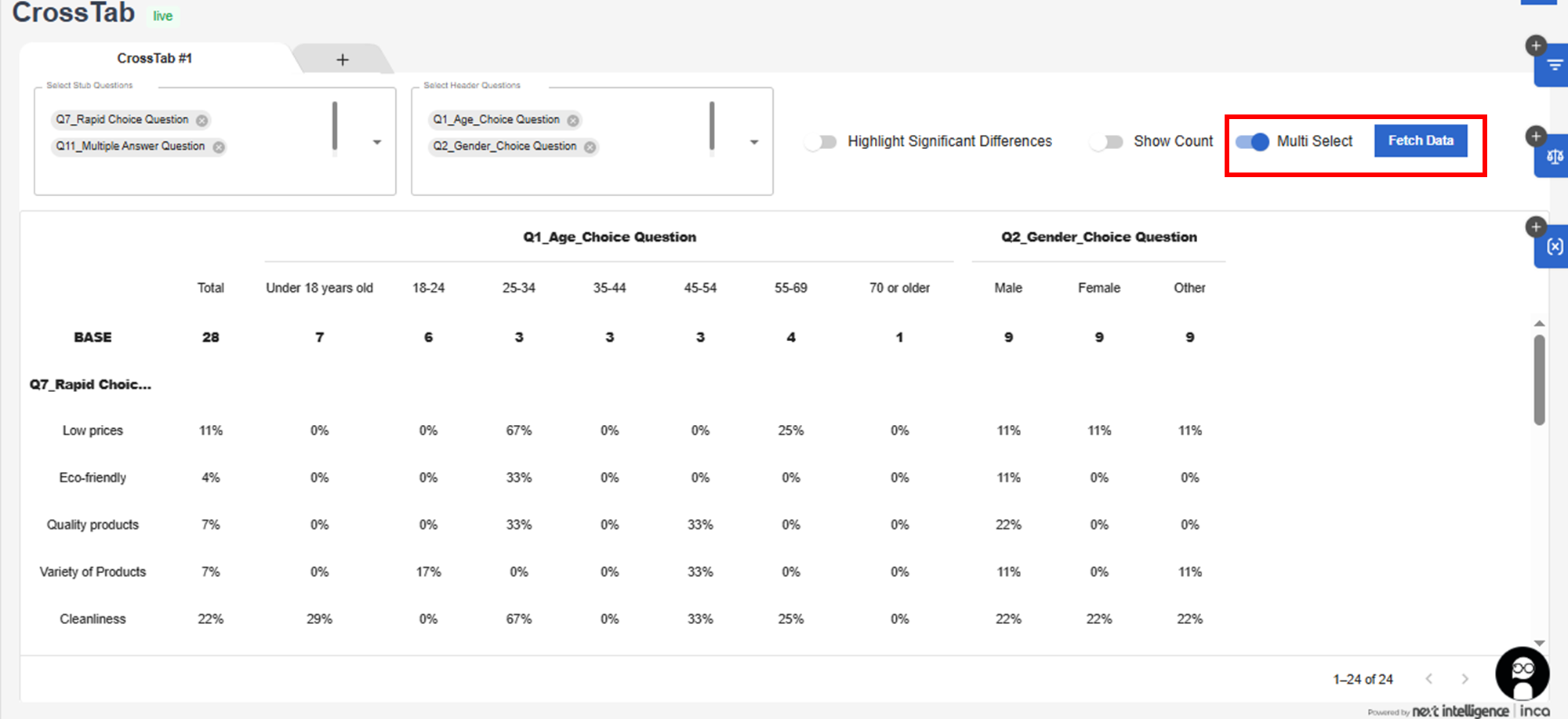 Please note: The Dashboard currently allows only one level of header or stub. So if we add multiple questions or variables to the header/stub, the variables will be independent.