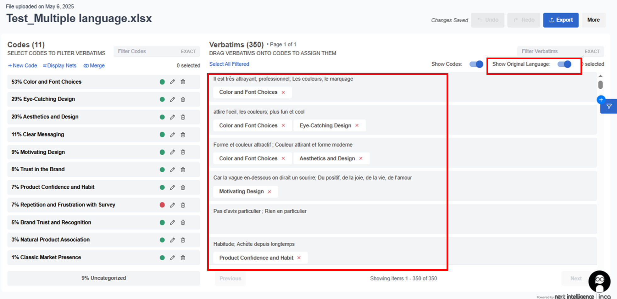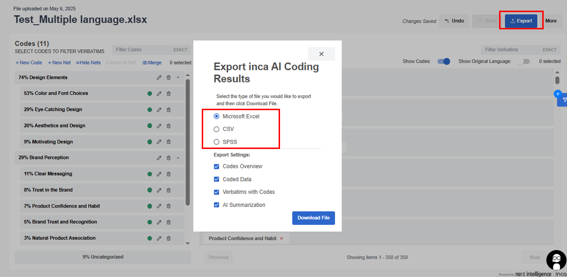 - Click the Export button and users can export the coded results in Excel, CSV and SPPS format. When downloading in excel format, it will generate the Codes Overview, Coded data, Verbatims with Codes and AI Summarization. Further details are in this article here.