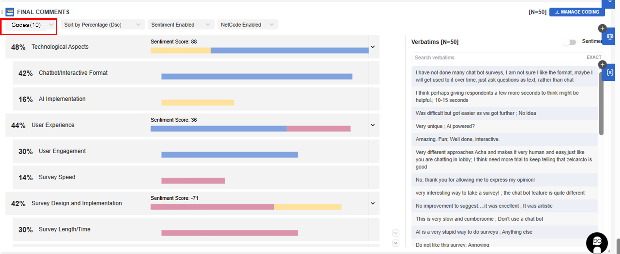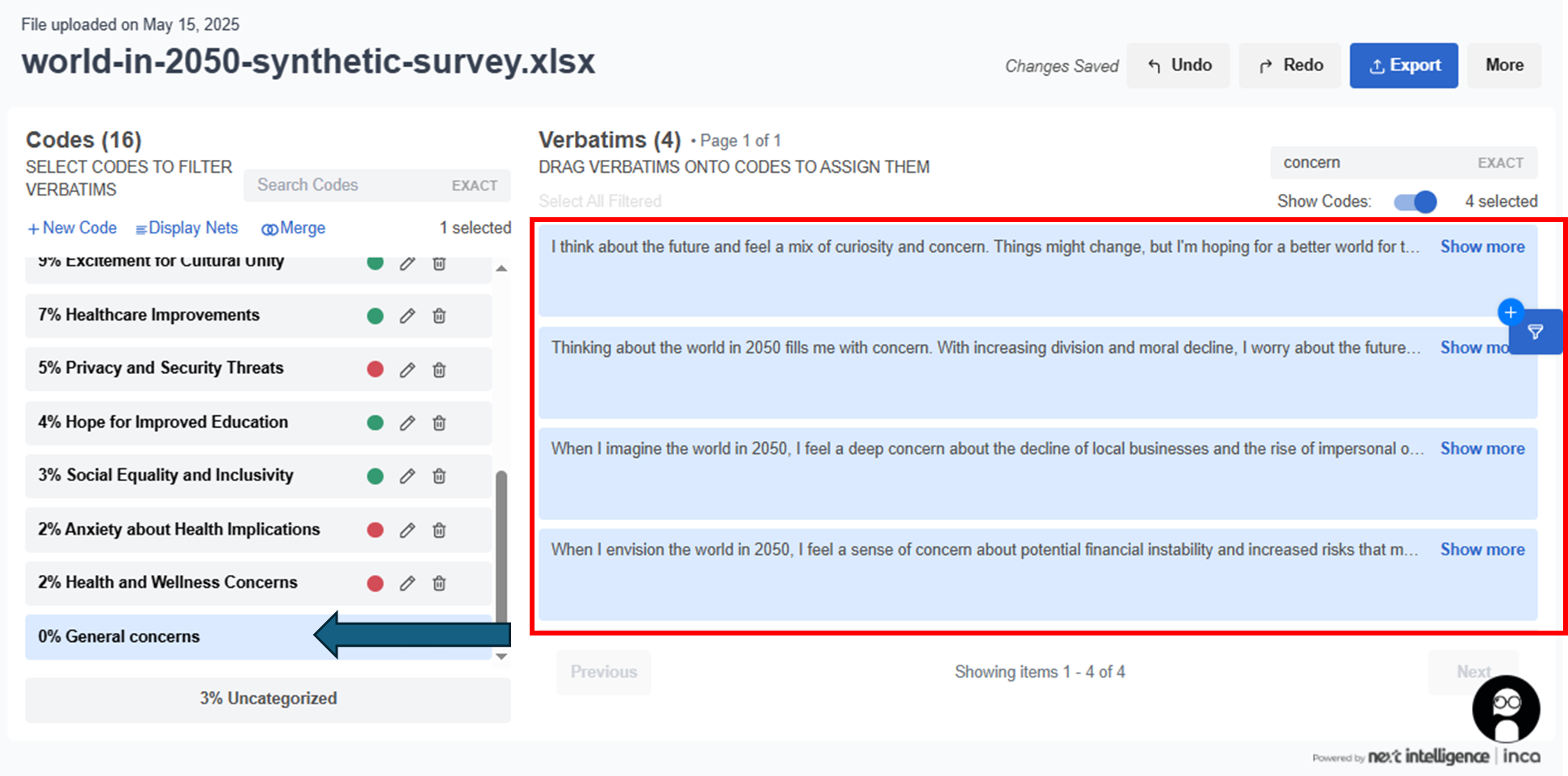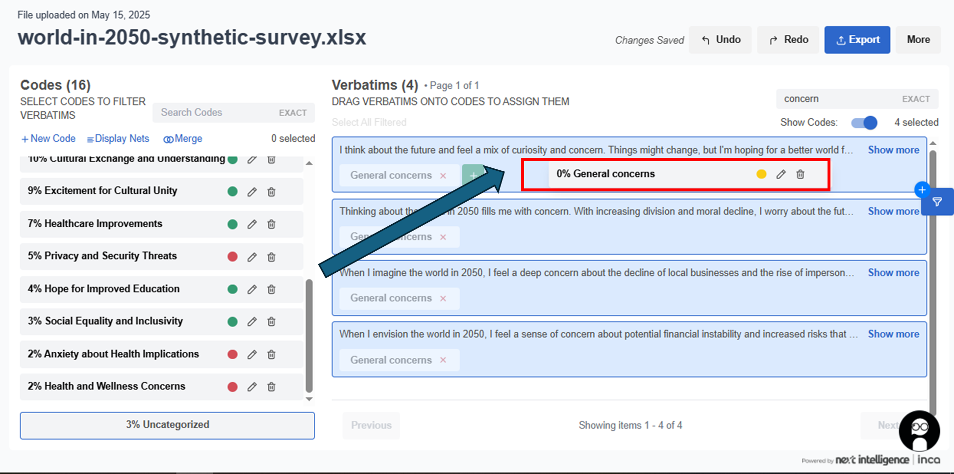 After dragging, the codes will be assigned on the selected verbatims and will appear just below each verbatim response