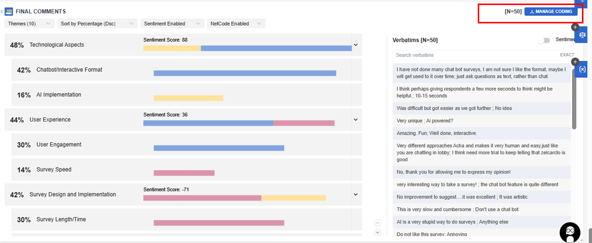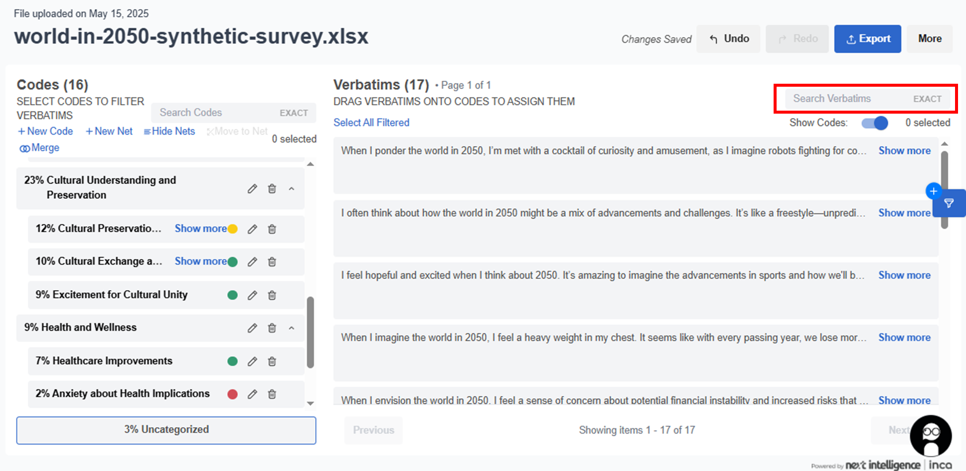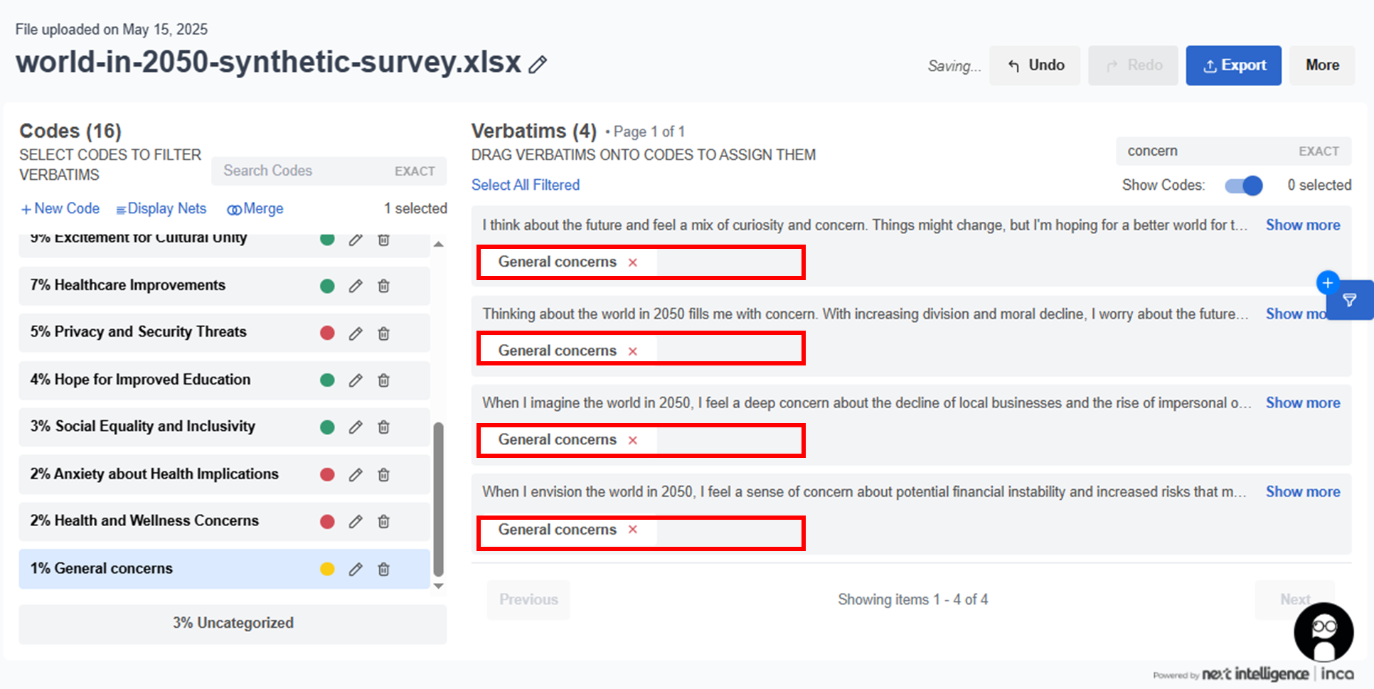 After dragging, the codes will be assigned on the selected verbatims and will appear just below each verbatim response