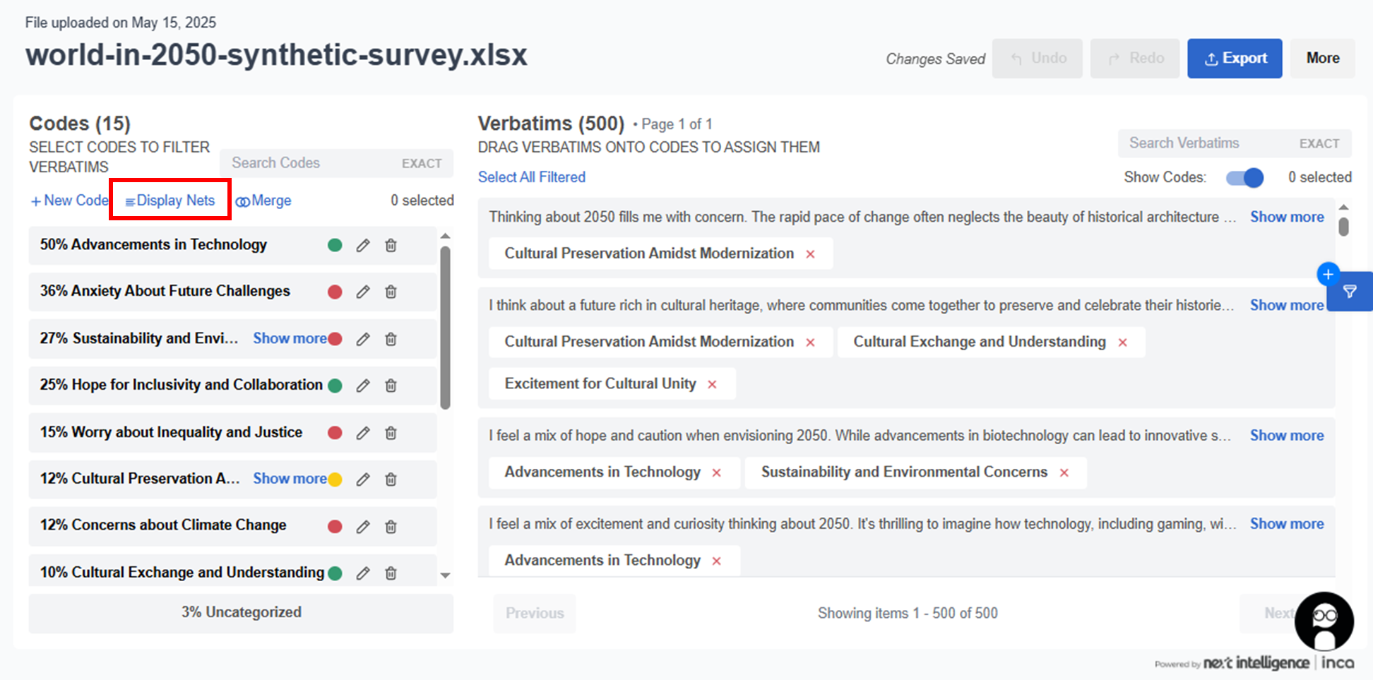 By default, the AI coding should match the codeframe that users have confirmed. The "Display Nets" is enabled by default, but users can turn it off to view only detailed codes.