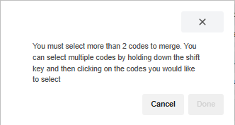 The merge button will always remain clickable. If fewer than 2 codes are selected, an instructional modal will appear instead of the merge modal to guide users on how to merge correctly.