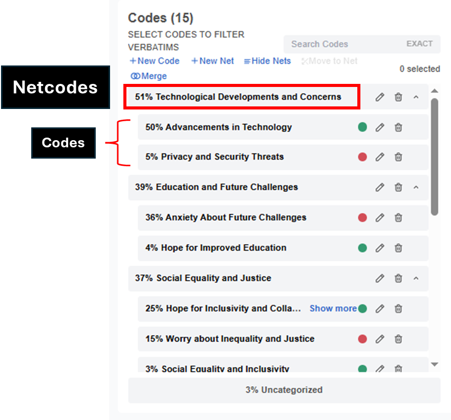 Regardless of how you are using the AI coding in the platform, once you are in AI Coding Edit page, you can add/remove/edit/merge the codes generated by the AI model. Or if you uploaded the code frame yourself, you can check the assigned code for each verbatim to check the accuracy of the AI code assignment and make the necessary revisions.