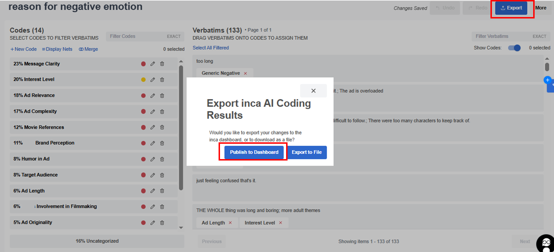 - When using Manage Coding feature, users will need to click Publish to Dashboard in the Export button to reflect the new coding in the dashboard.