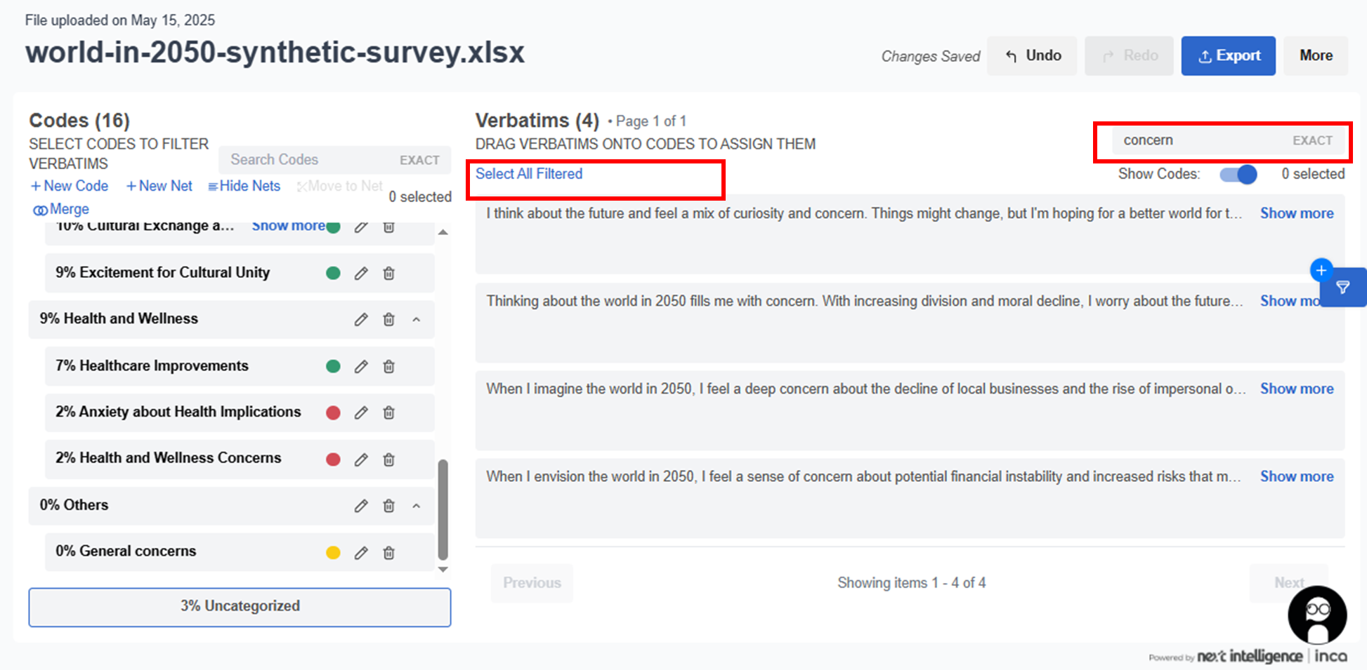 In the Search Verbatims box, you can input the code or keyword you want to use. Then click Select All Filtered.