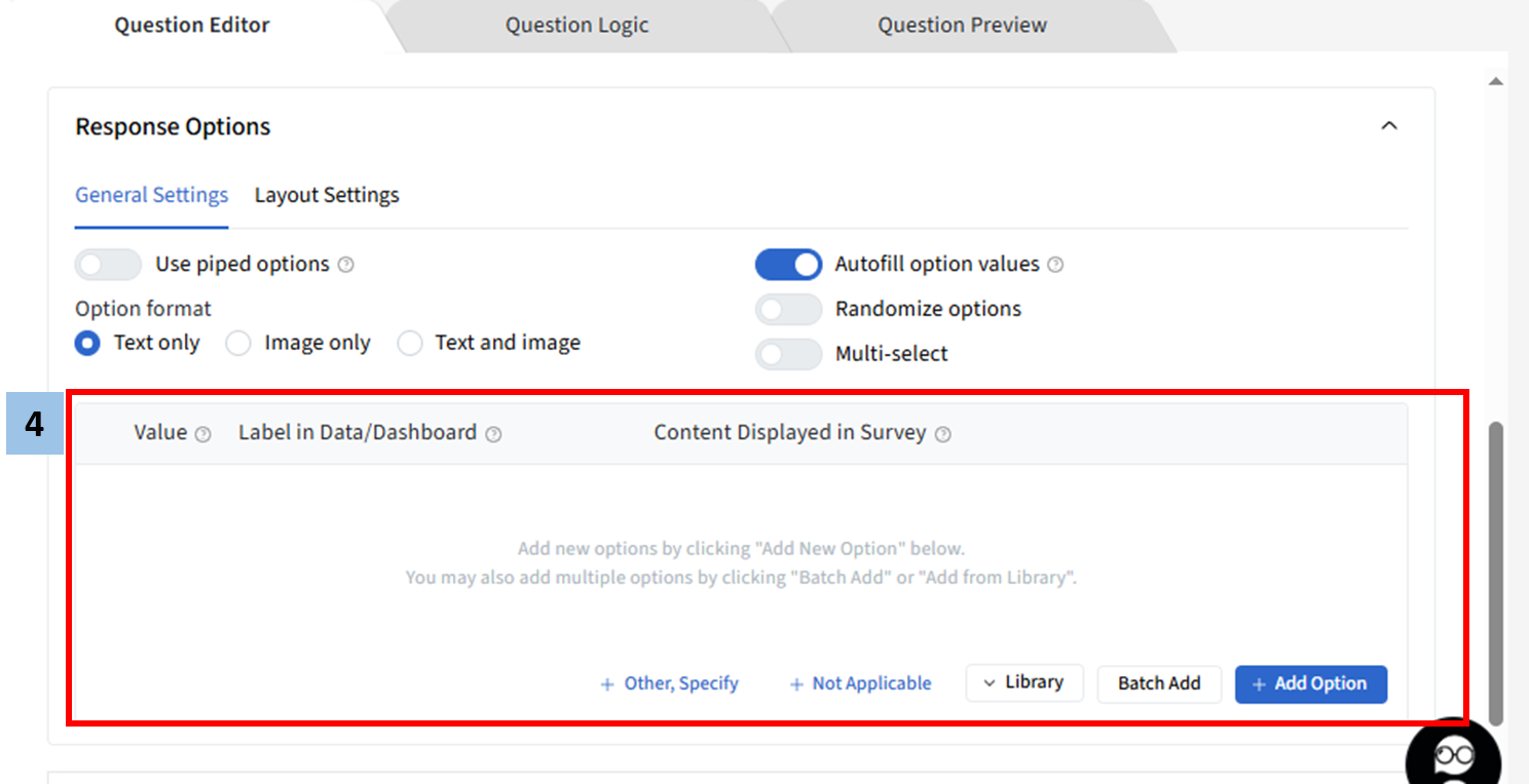 - When adding Options (whether individually, batch add or from Library) , the Value or option codes as well as the Label (what appears in result visualization or dashboard) will also be automatically updated, but can also be modified by users.