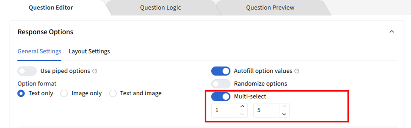 - To make the question a multiple choice, toggle on Multiple Selection, and using the drop down, you can select (or type in) the least number of allowed responses (left) and the maximum number of (right) allowed responses.