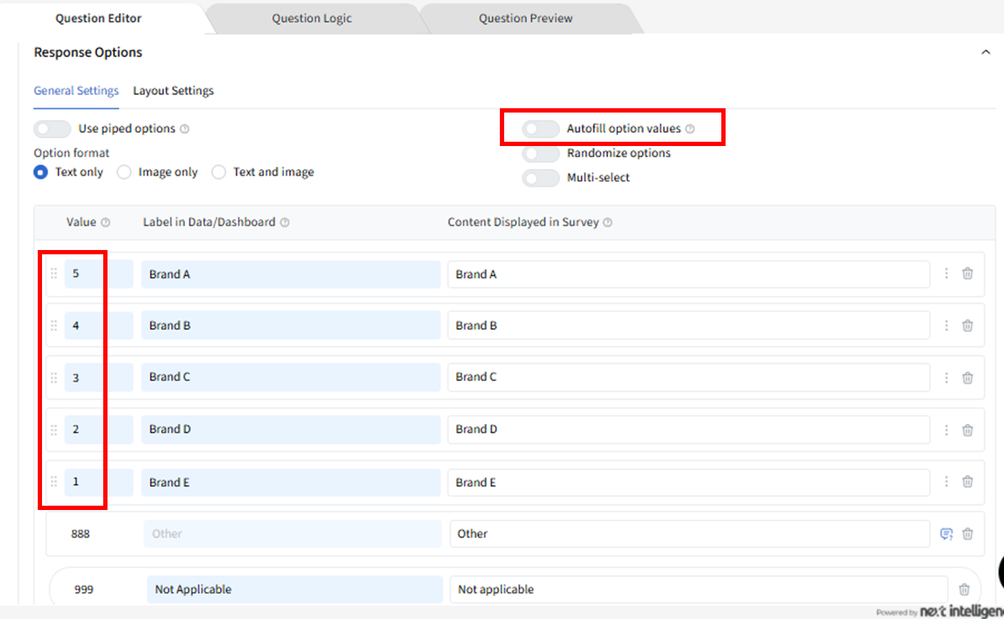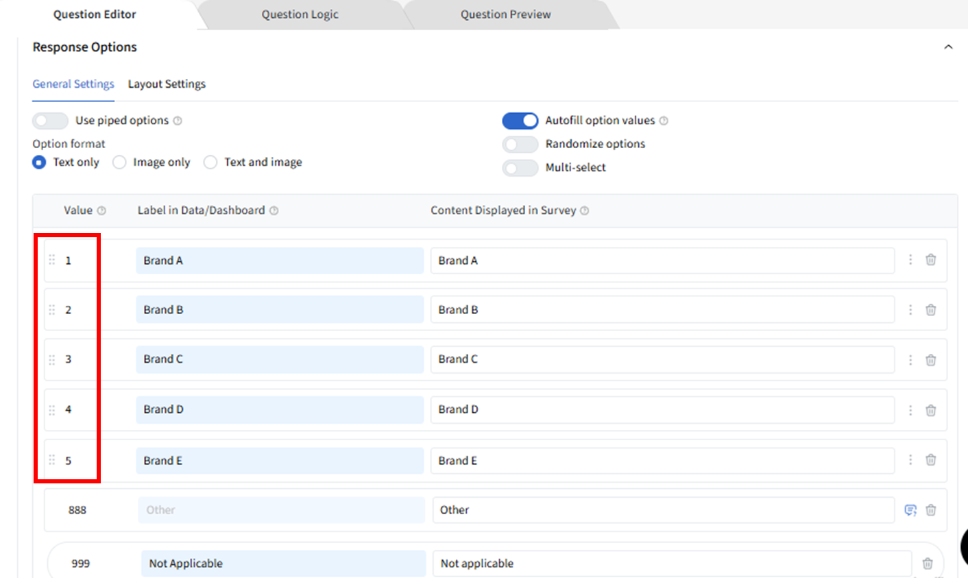 Please note that the options values for Other (888) and Not Applicable (999) cannot be modified even if Auto Filled Options is disabled