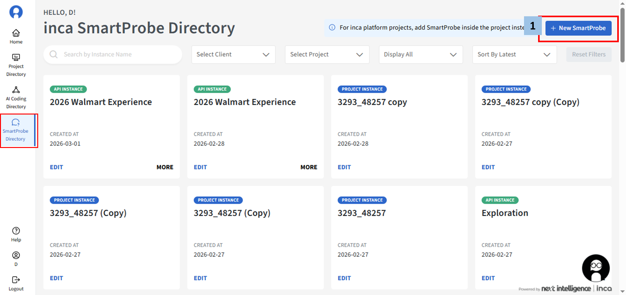 1. API users need to create an inca account (through an invitation from their inca Customer Success Manager or main contact person). Once on the inca platform and logged into their account, API users will have access to the SmartProbe Directory, where they can create new SmartProbe instances by clicking + New SmartProbe.