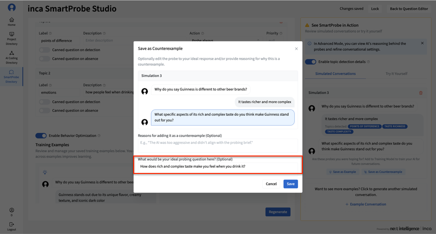 When optimizing the probing of an open-ended question, you may select any combination of the following settings in the inca SmartProbe Studio. Optimizing probes thru these Advanced Settings works the same whether your are using the inca platform or the API.