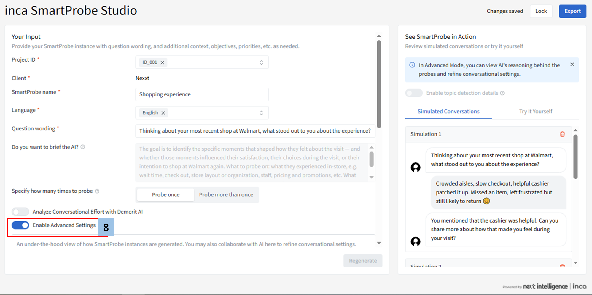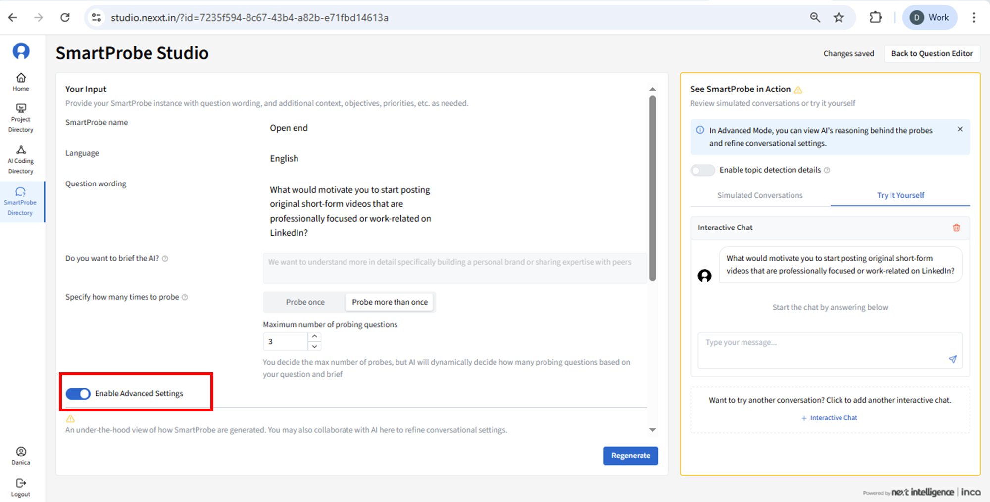 8. If the generated probes are still not right with the current configuration — or if you're optimizing a complex or high-stakes question — enable Advanced Settings.
