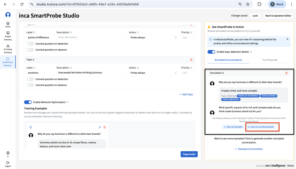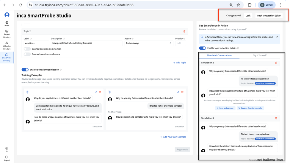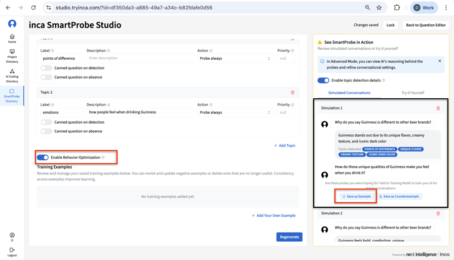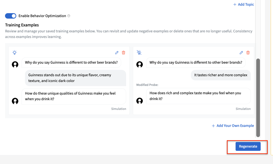 The probes generated above does not consistently address your specific objective. Thus, using Behavior Optimization can help with this. Click "Go to Smartprobe Studio" and then enable Behavior Optimization. Once enabled, you will see the Simulated Conversations on the right side.