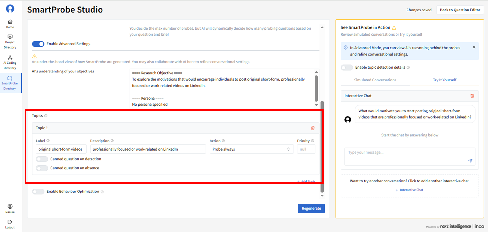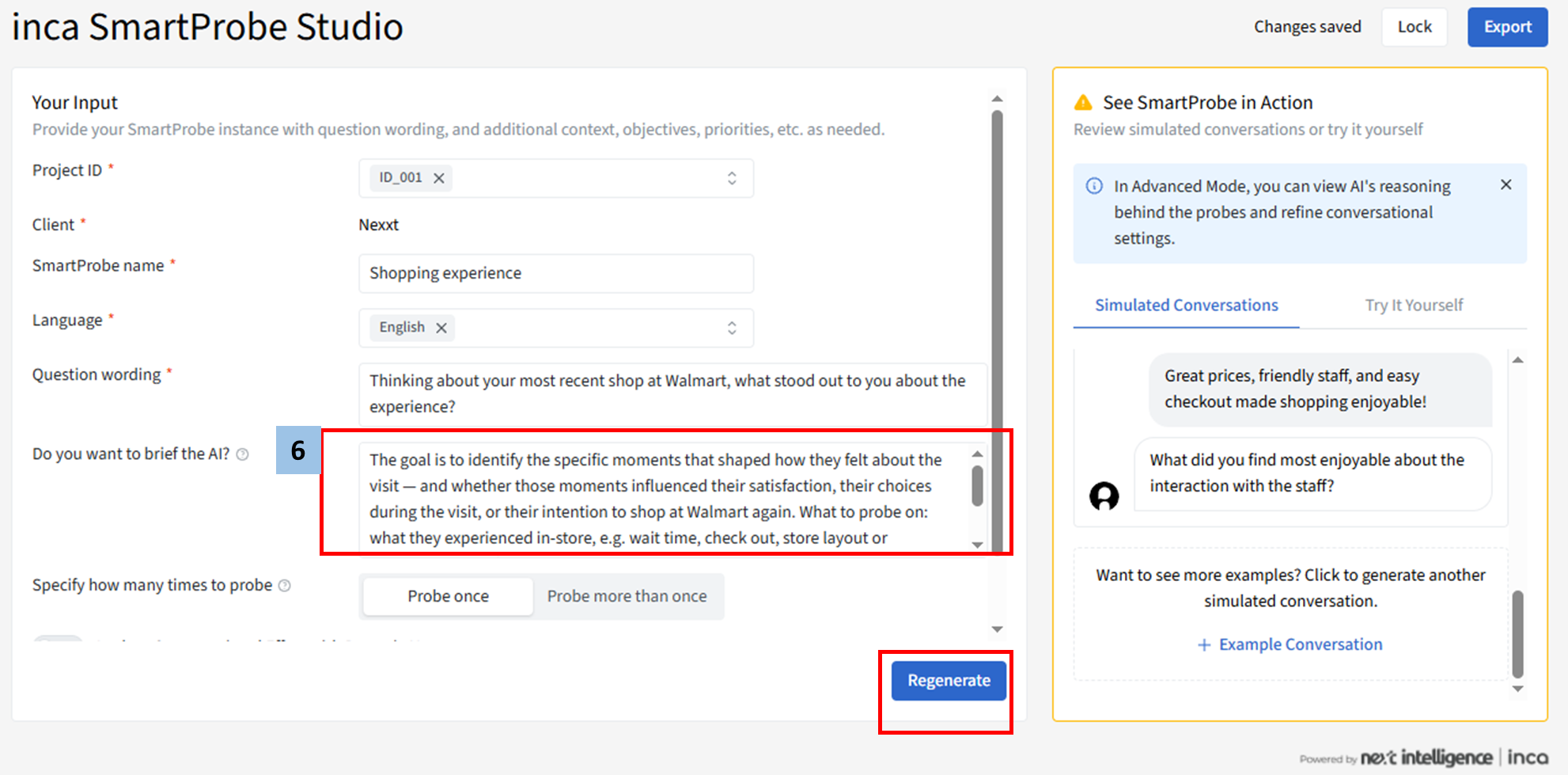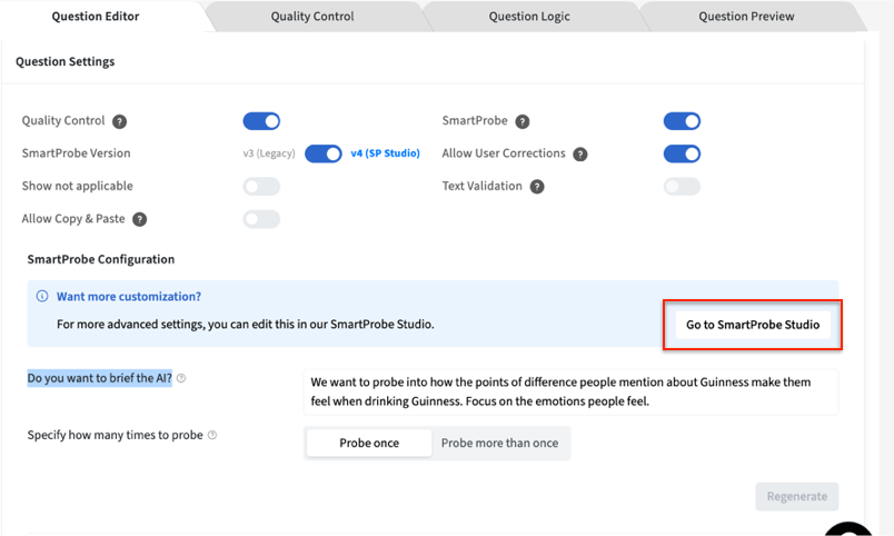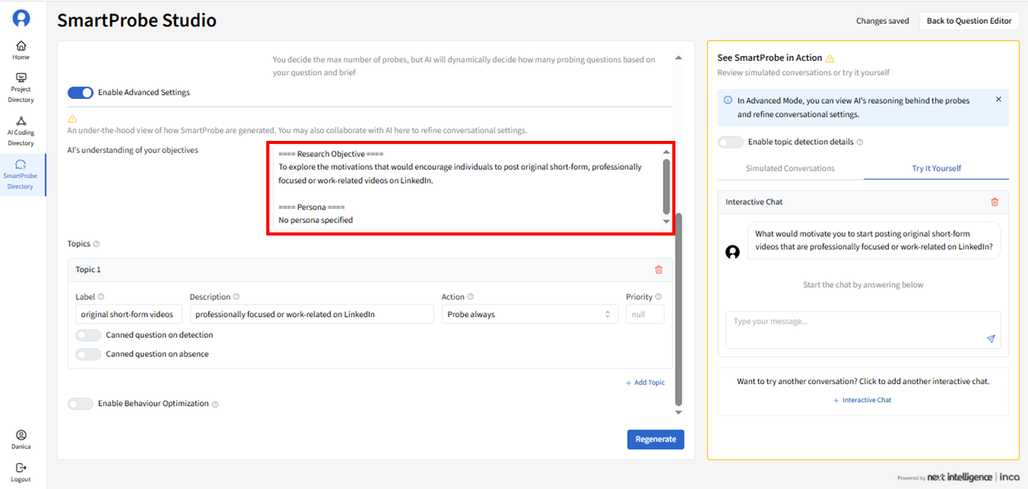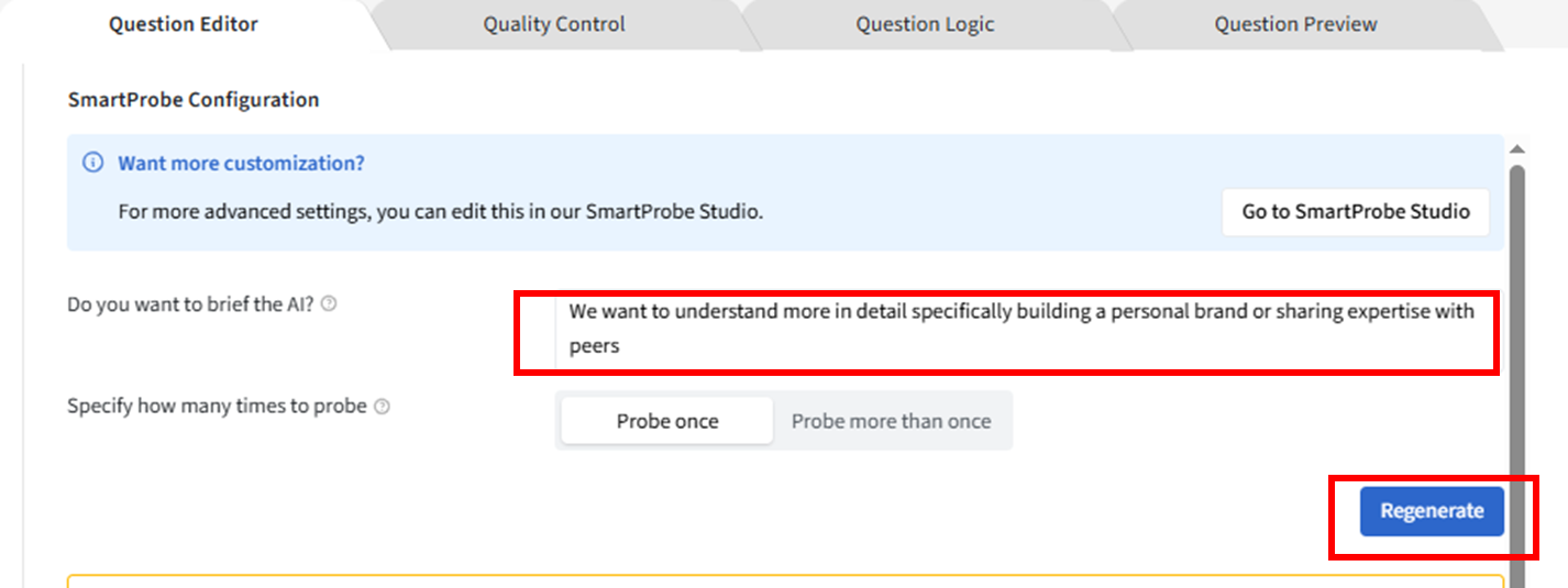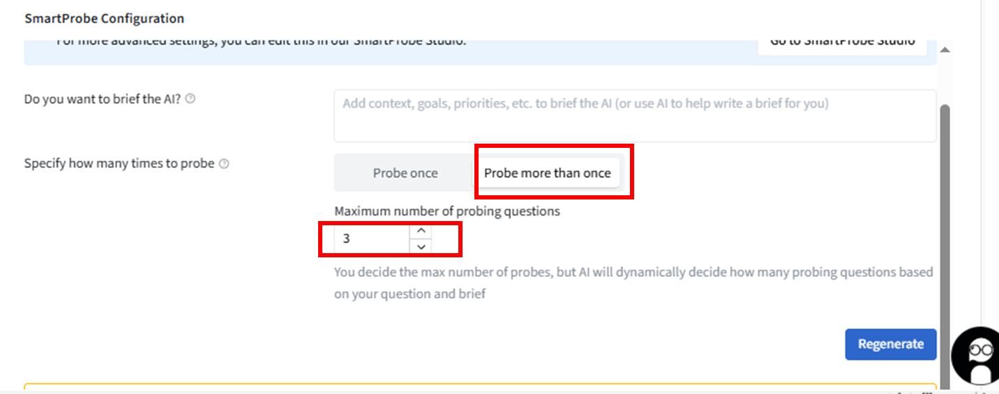 6. Users also have the option to brief the AI — and for most projects, we recommend it. This is where you can share your research objectives, any specific topics you want to explore or avoid, and any context that would help the AI probe more purposefully. Add your question objective and click Regenerate.