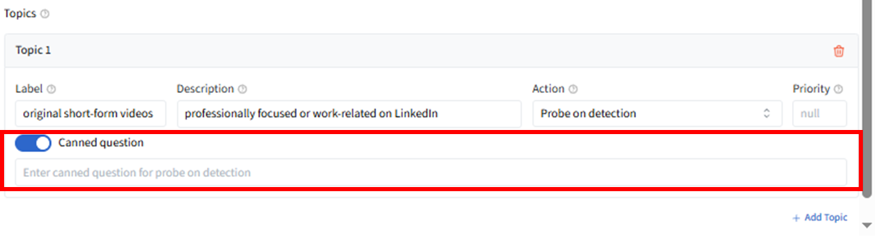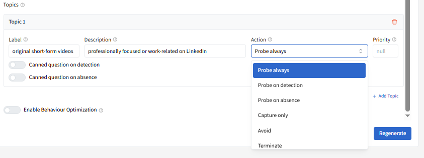Probe on detection: triggers to probe on this topic if the topic is detected. In other words, SmartProbe will probe for more details when a participant has mentioned this topic.