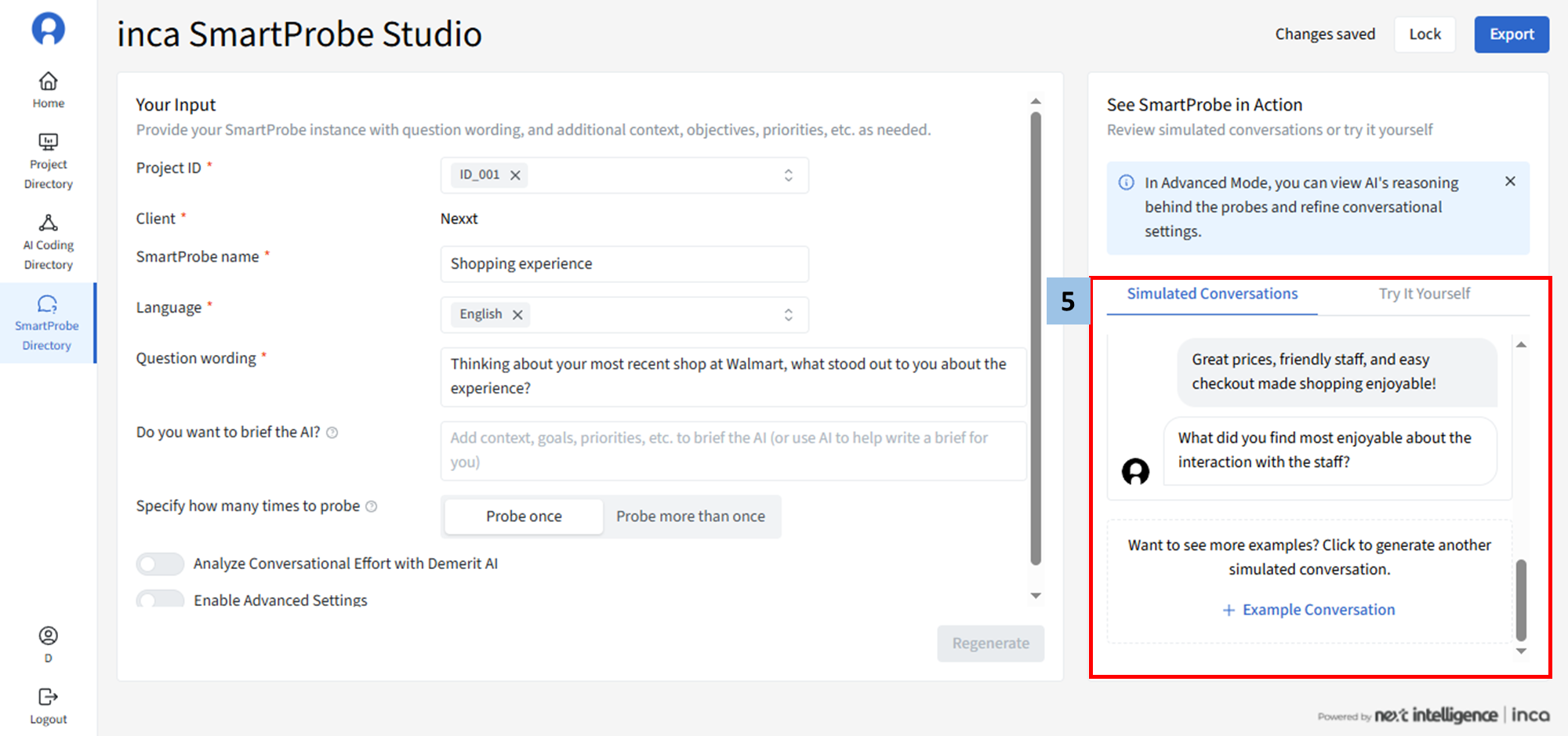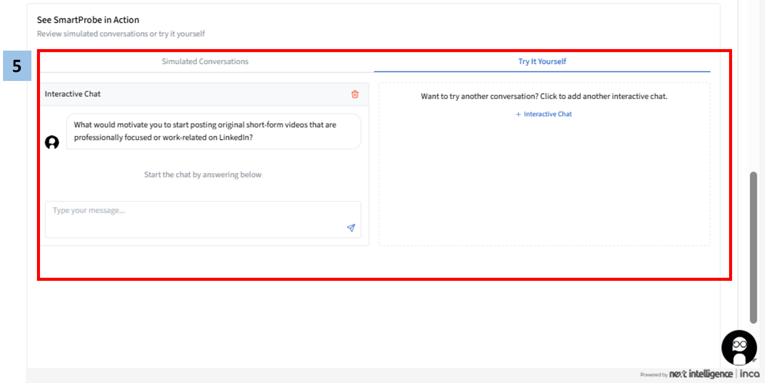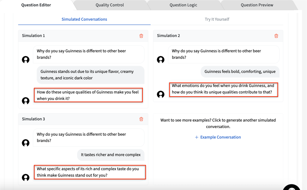 5. Users will see sample generated probes in the Simulated Conversations section. If you would like more examples, click + Example Conversation. You can also try answering the question by toggling Try It Yourself.