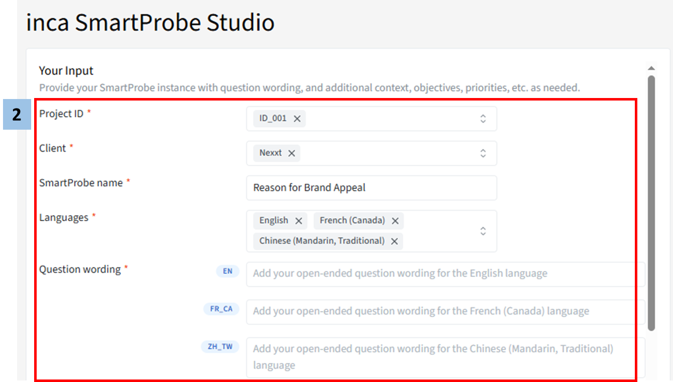 Language - inca SmartProbe probes in 90 languages natively. Users can select multiple languages for a multi-country study, but you'll need to provide question text in each language you select but the AI always works in English internally.