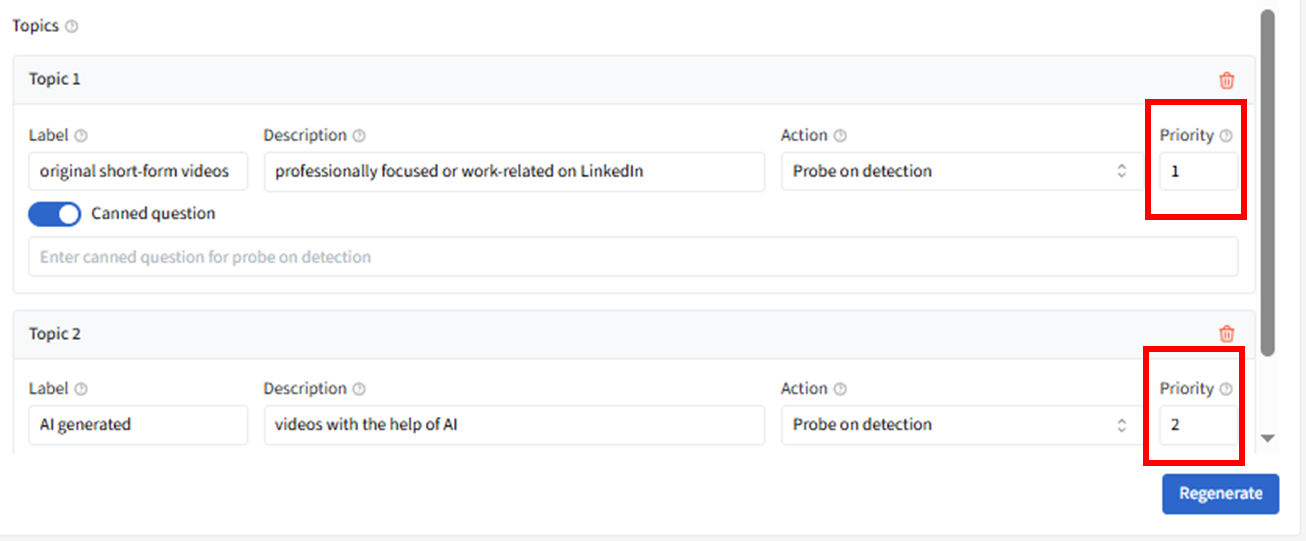 Since each request only produces one probe question, if multiple topics are triggered to probe, then SmartProbe will randomly choose one of them to focus on. This randomization behaviour is the default, but you can override by adding a priority field to the topic (a number, 1-10, with 1 indicating “highest priority” and 10 indicating “lowest priority”). Each topic must have a unique priority number. The order of the topics is not important: only the priority field indicates a preference between topics