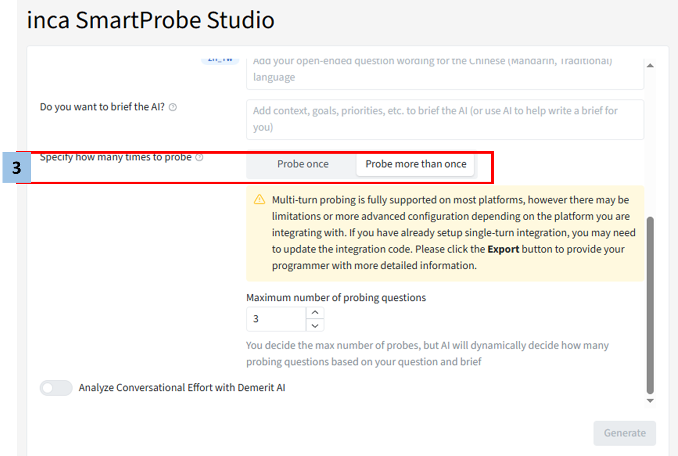 Multi-turn probing is fully supported on most platforms, however there may be limitations or more advanced configuration depending on the platform you are integrating with. If you have already setup single-turn integration, you may need to update the integration code. Please click the Export button to provide your programmer with more detailed information.