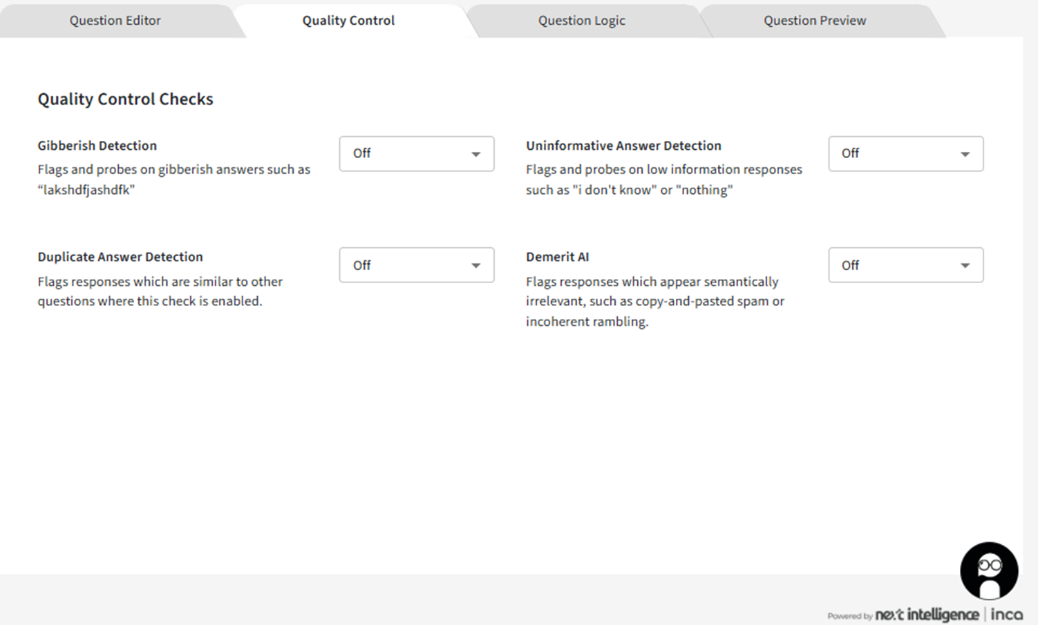 When adding an open-ended question, you may select (click the drop down and select On) any combination of the following checks through the Quality Control tab: