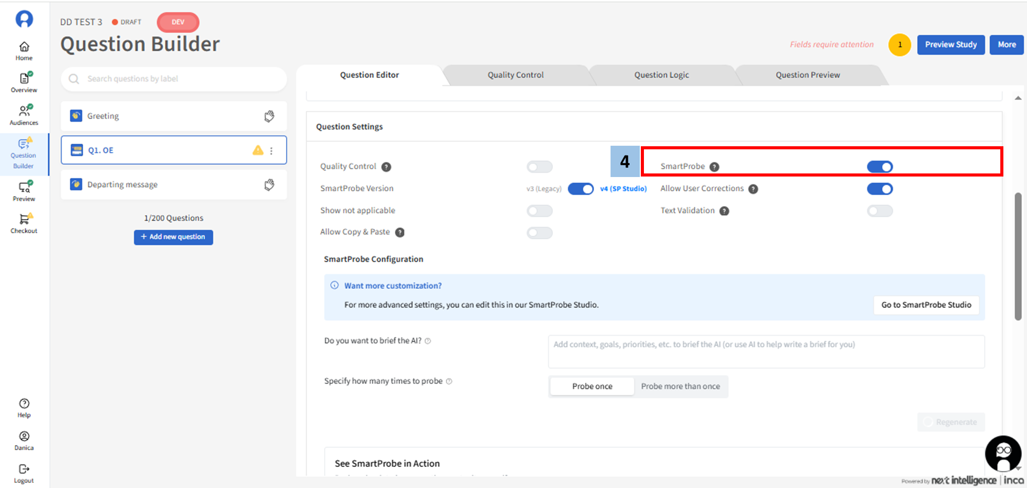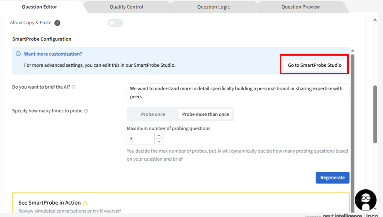 4. When you want the AI to probe participant answers and prompt them for answers that could have more value/insight derived from a follow-up, enable the probing by turning on “SmartProbe” toggle in Question Settings. Wait for “SmartProbe Configuration” to load.