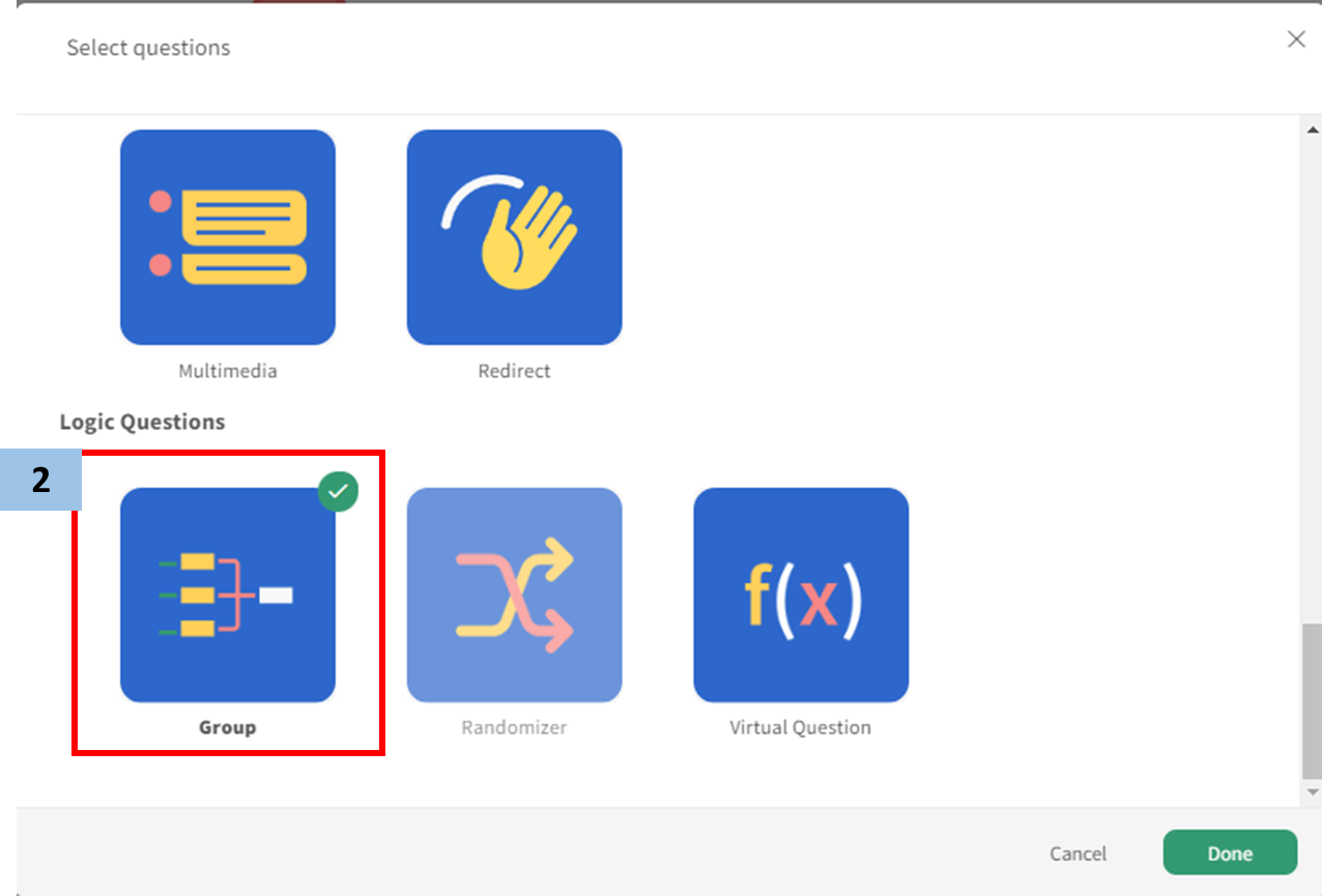 This question type is mainly used to combine groups of questions or to create an umbrella question with sub-questions inside. In this way, the user can control the routing or define the question flow and how they want to show sub-questions to participants and help with the question flow.