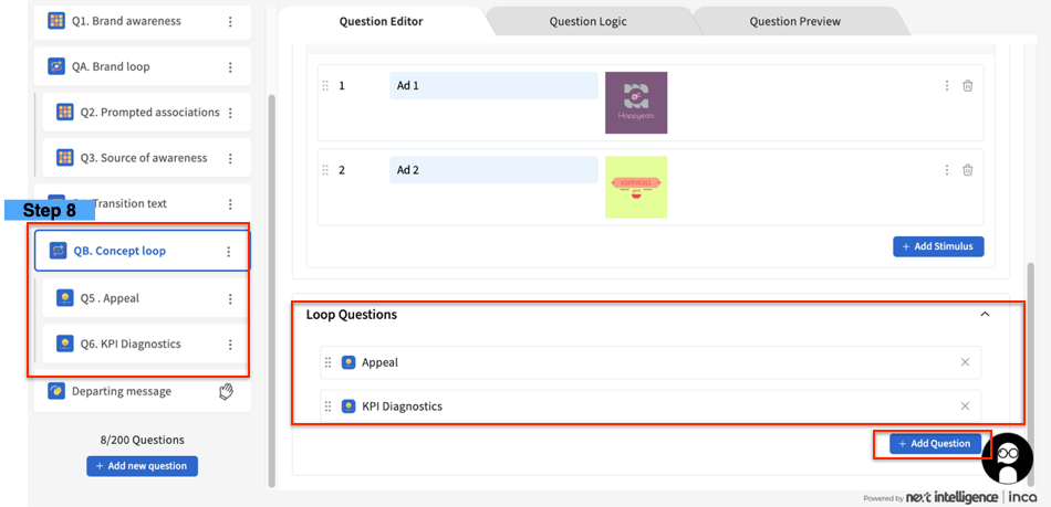 8. After adding the Monadic questions in the Loop Question field, you will see that the two question cards (Appeal, KPI Diagnostics) will be nested automatically in the Loop question card (i.e Concept loop) in the Question Builder tree