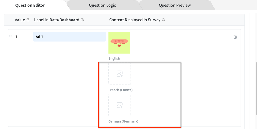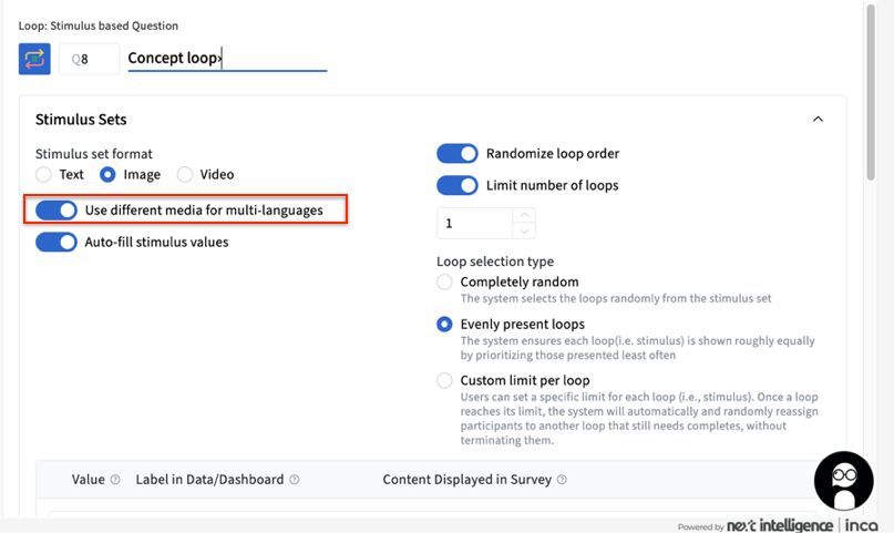 In the Project Overview, make sure to add the different languages you require for your study. Then In the Loop: Stimulus based question, enable the Use different media for multi-languages.