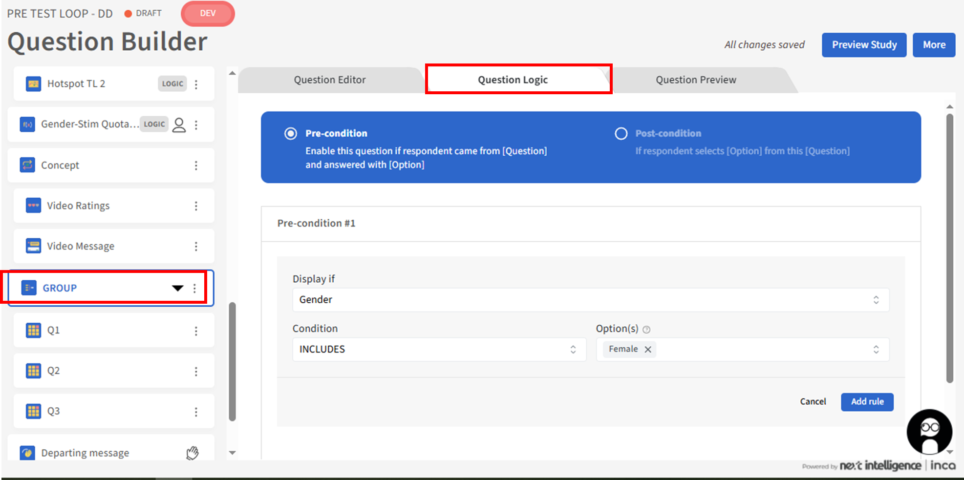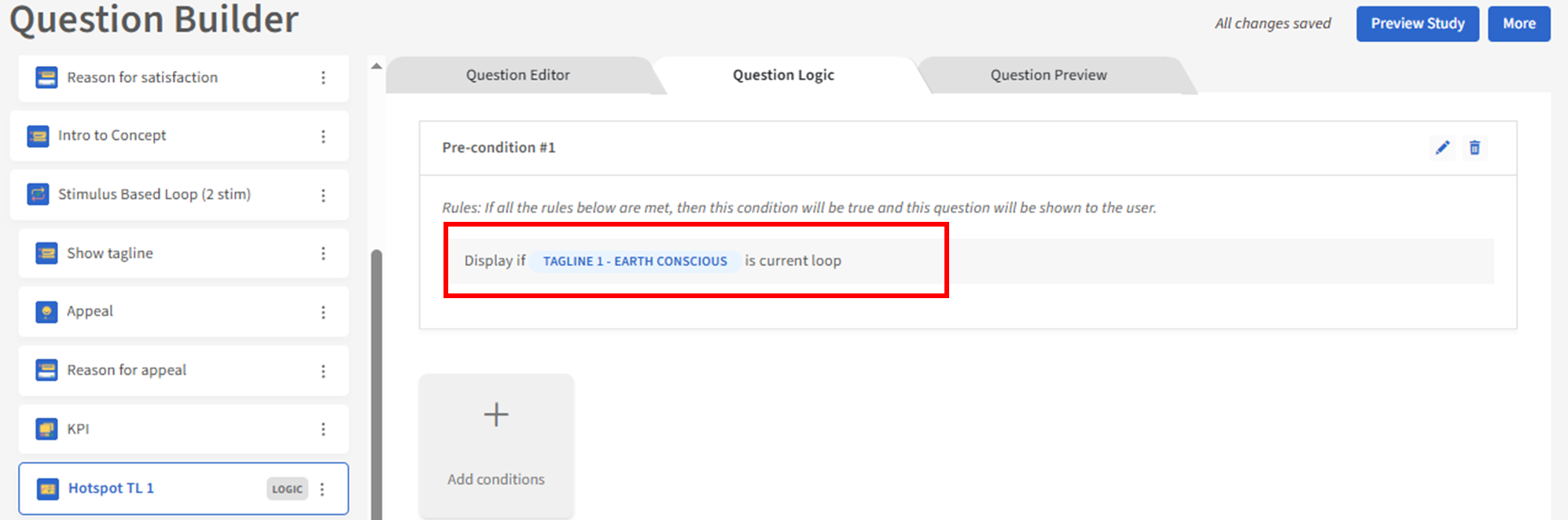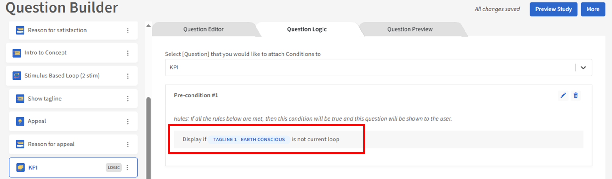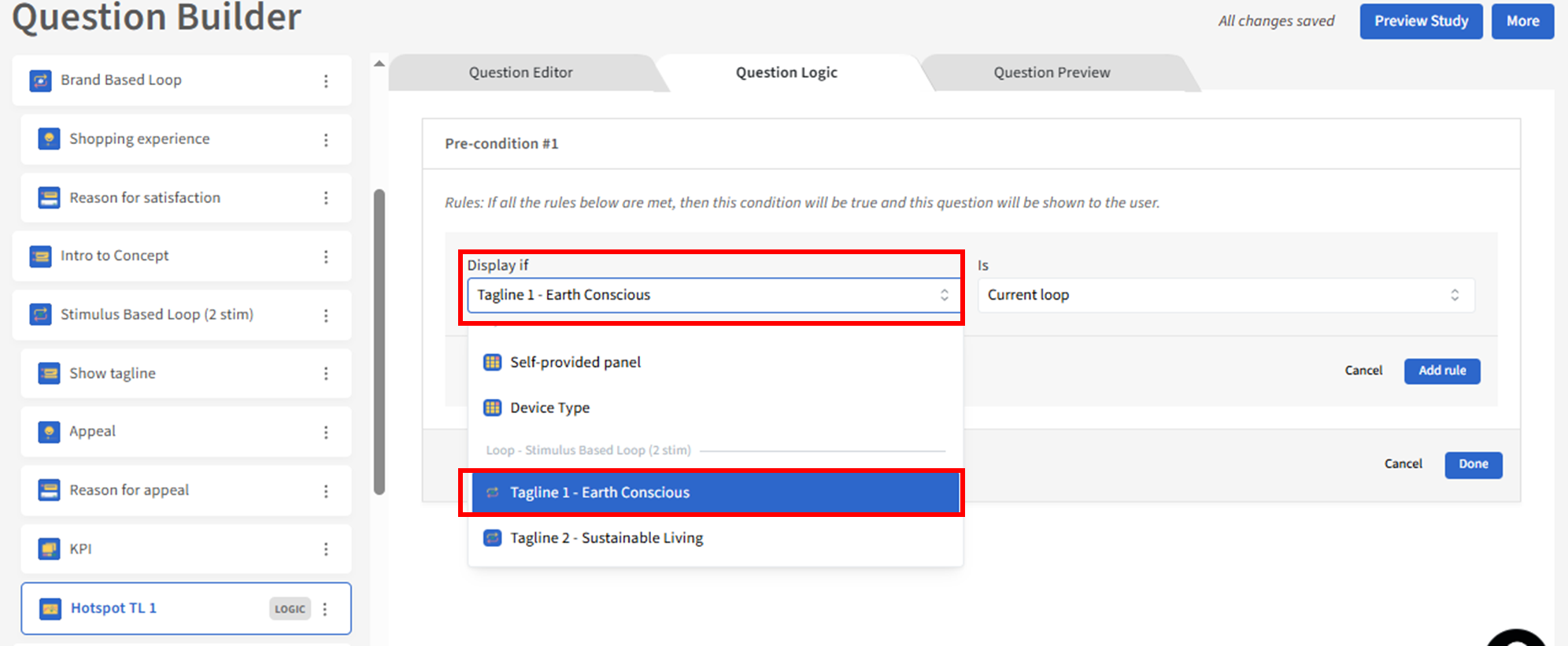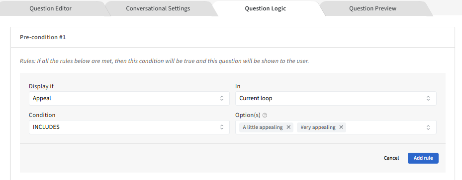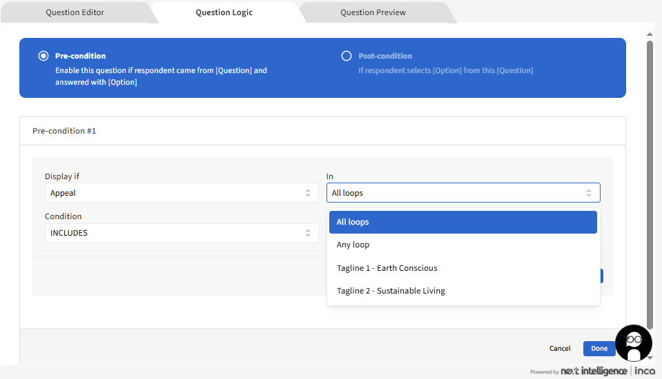 1. The first type is loop-based—specifically, users can set preconditions based on which loop the respondent is currently in. This allows them to show or hide questions depending on the active loop. In the Question Logic tab, users can reference a loop name to define whether it IS or IS NOT the current loop.