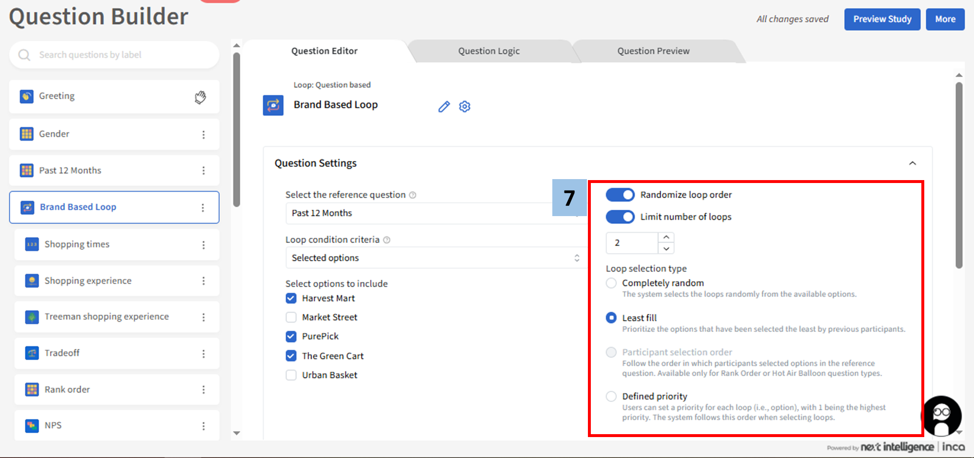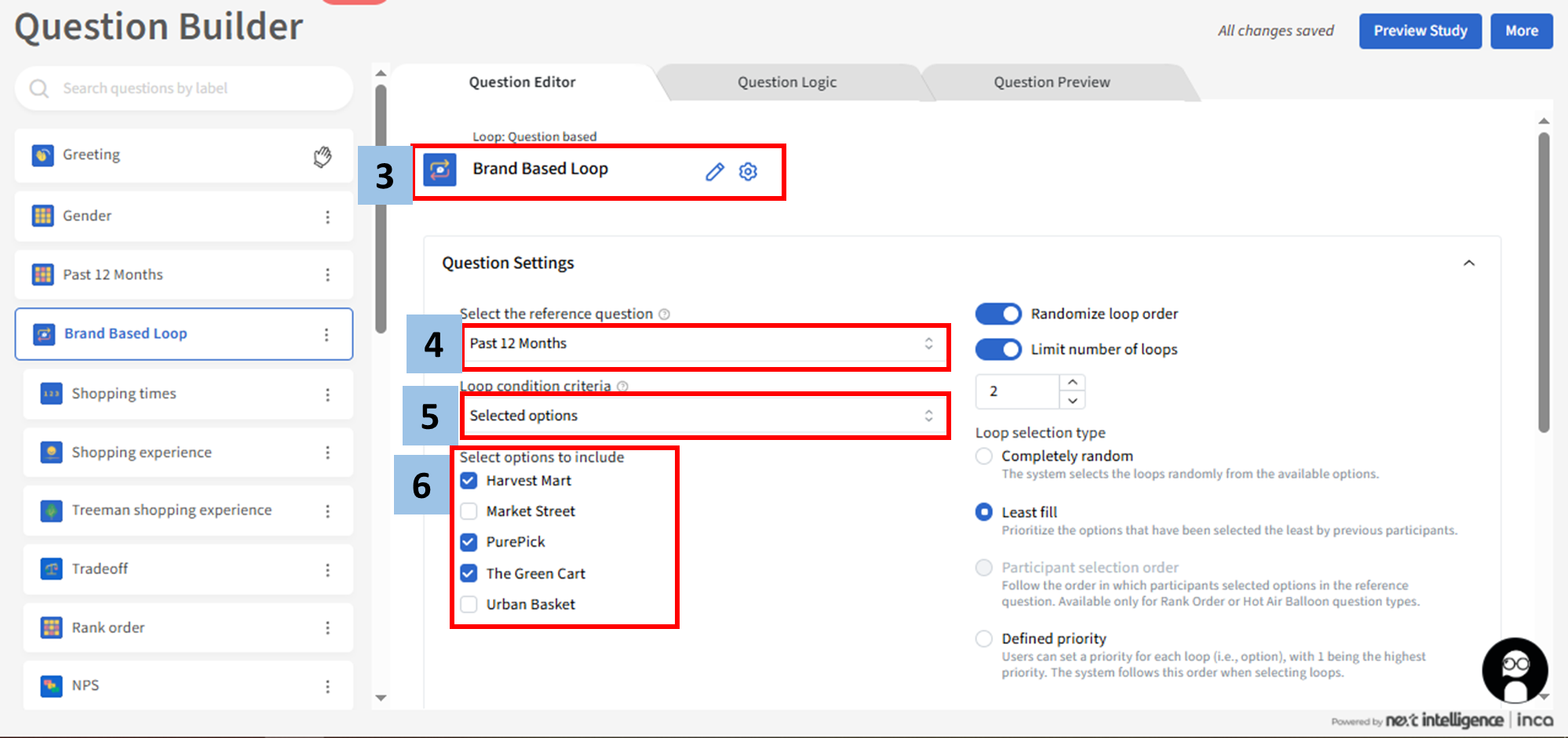 In addition, various randomization and selection modes can be applied directly within the loop question to support use cases such as random selection, least fill, or defined priority. For example, in Example 1 above, users don’t have to ask about every brand the respondent is aware of—they can randomly select a subset, prioritize brands based on predefined importance, or select those that have been chosen least frequently by previous respondents (least fill).