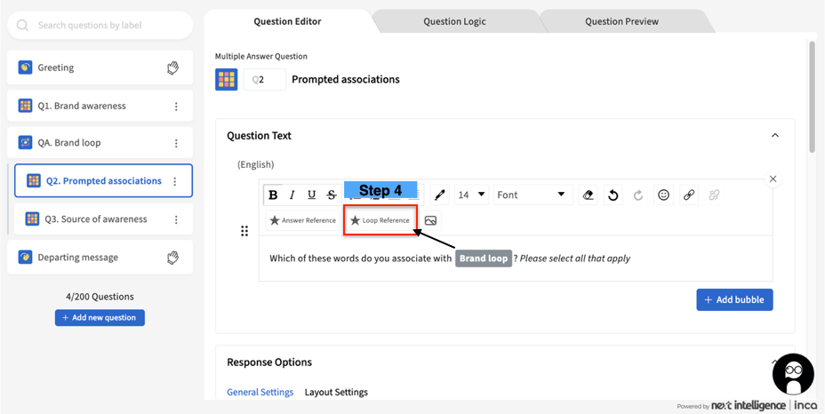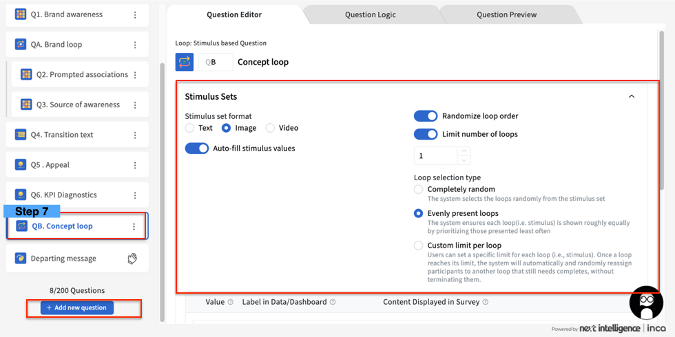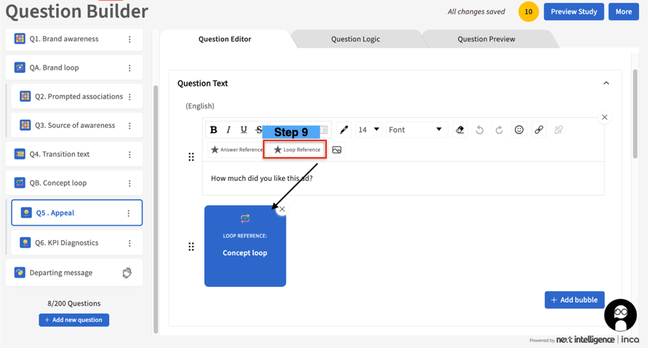 9. Make sure to use the "Loop reference" in each monadic question whenever applicable, so each concept text/image/video will be shown properly in the chatbot when the Loop questions are asked